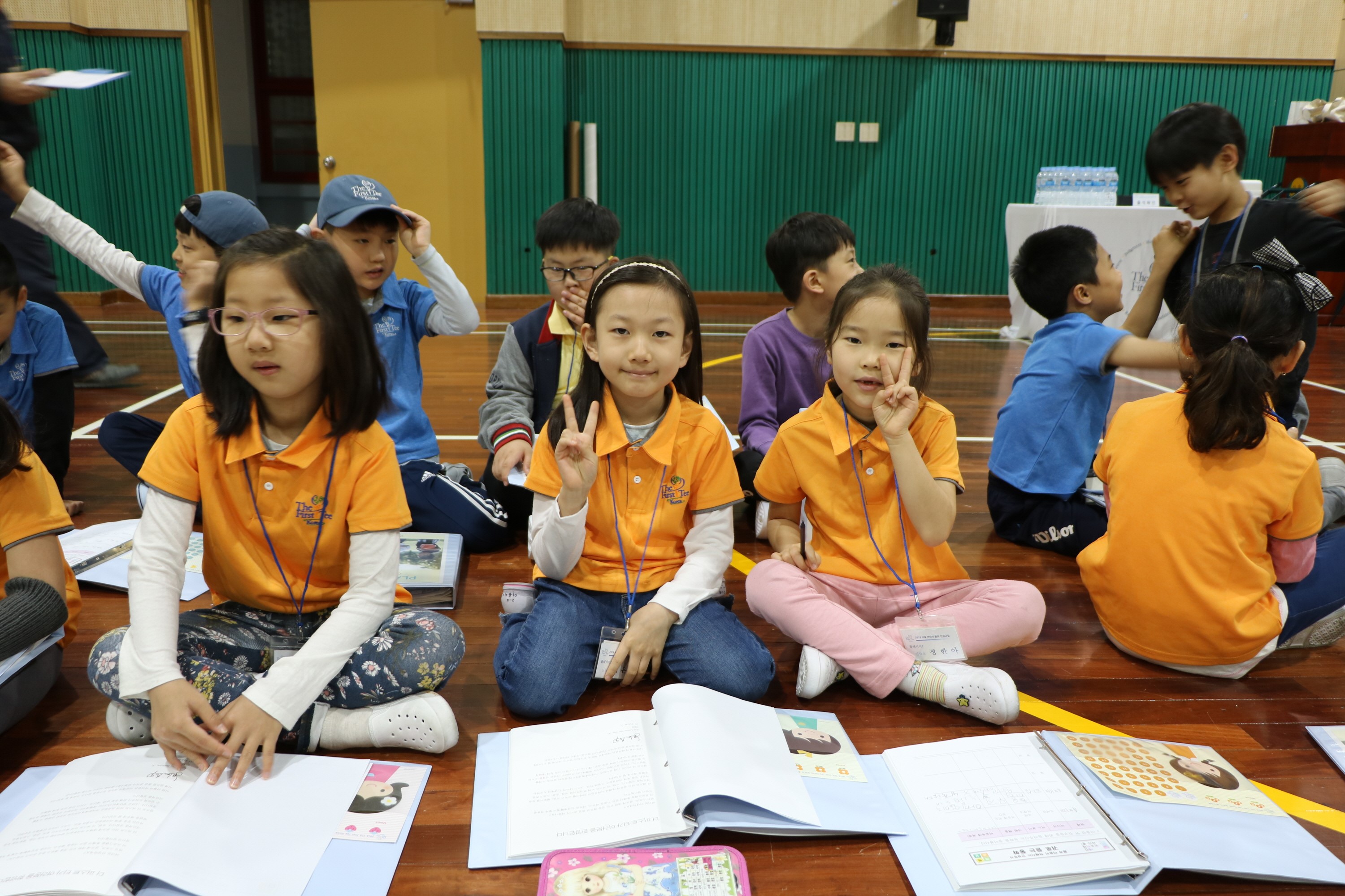 집에서 스스로 해온 과제를 자랑스럽게 펼쳐놓고 않아 잇는 아이들