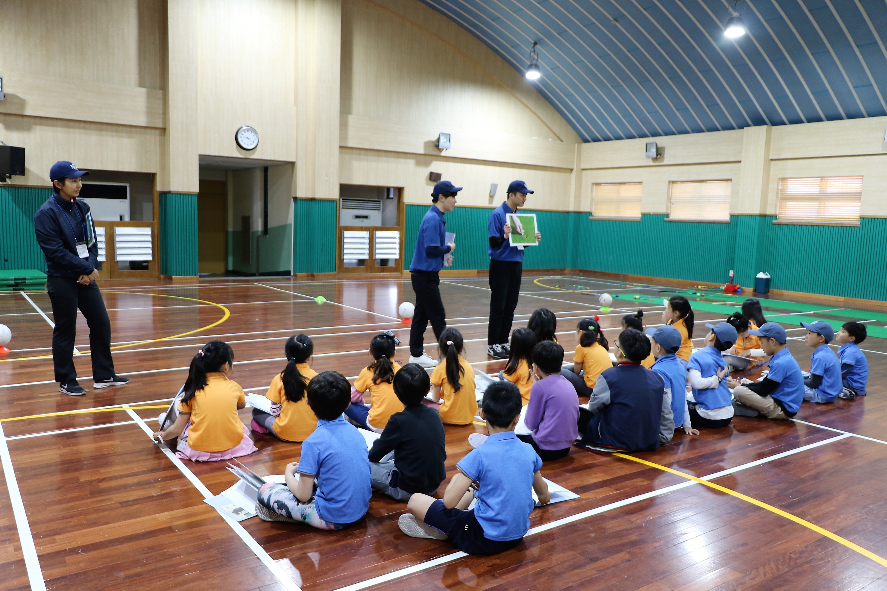 골프코스에서 책임감 있는 플레이어가 되기 위해 자신이 만든 디봇을 수리하는 방법에 대해 배우고 있는 아이들