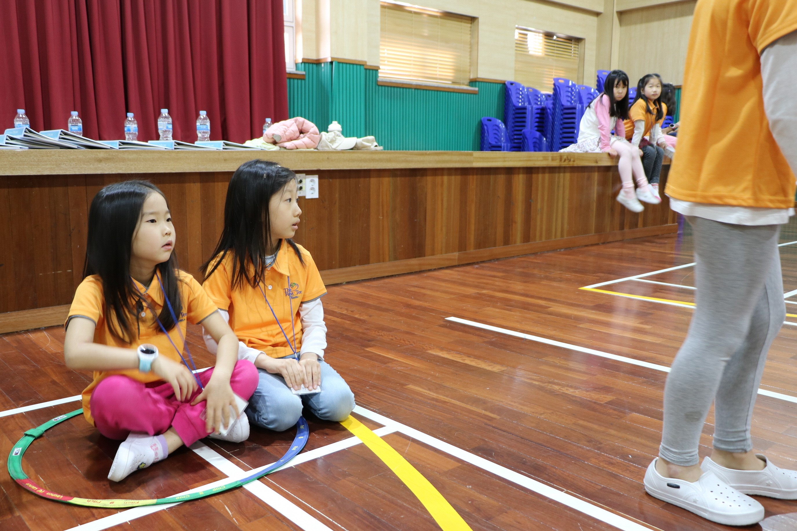 쌍둥이 자매처럼 얌전하게 안전구역에서 다른 친구의 플레이를 지켜보고 있는 아이들