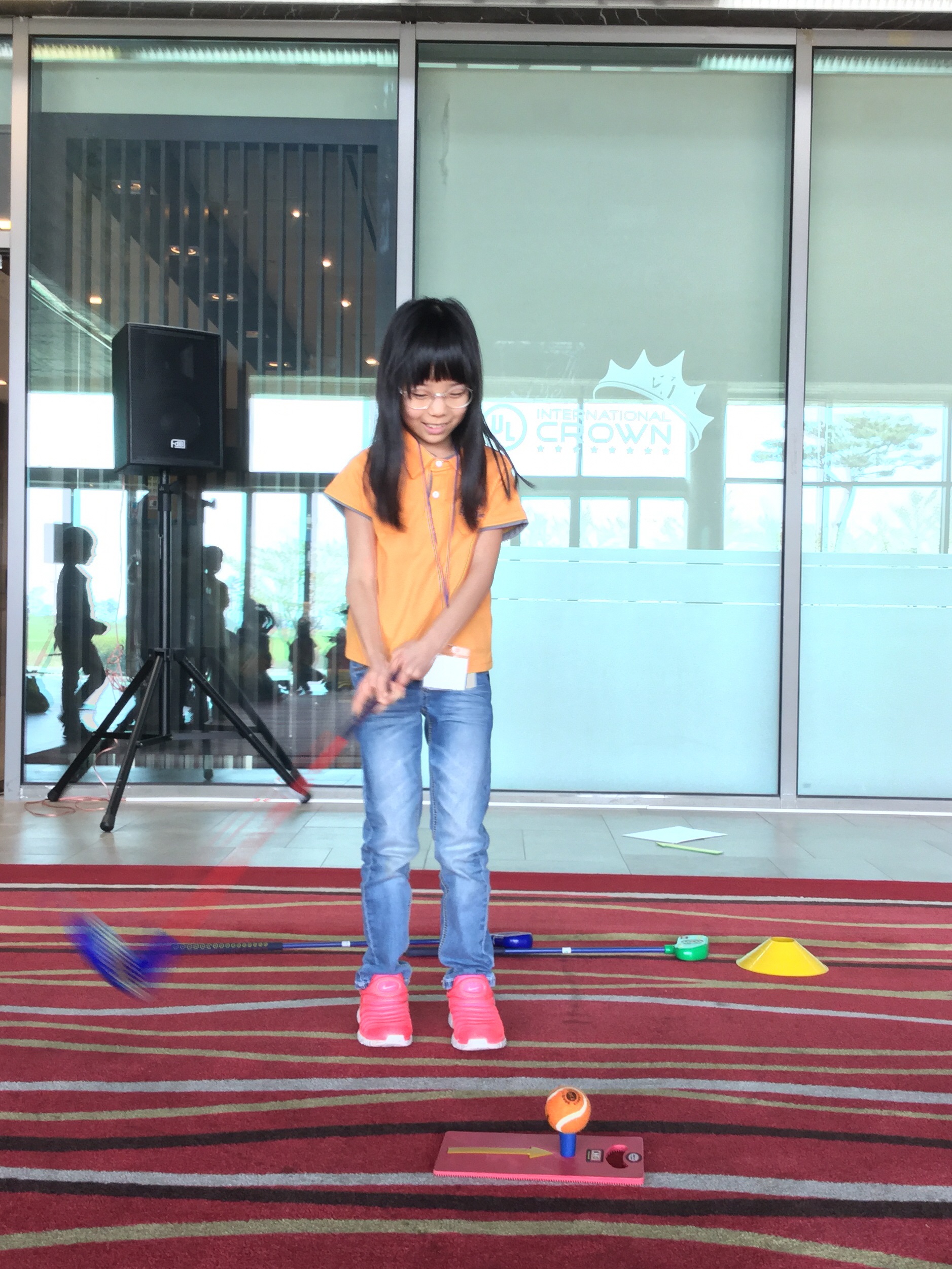 런처패드 위에 있는 볼을 헤드업 하지 않고 신중하게 치고 있는 모습