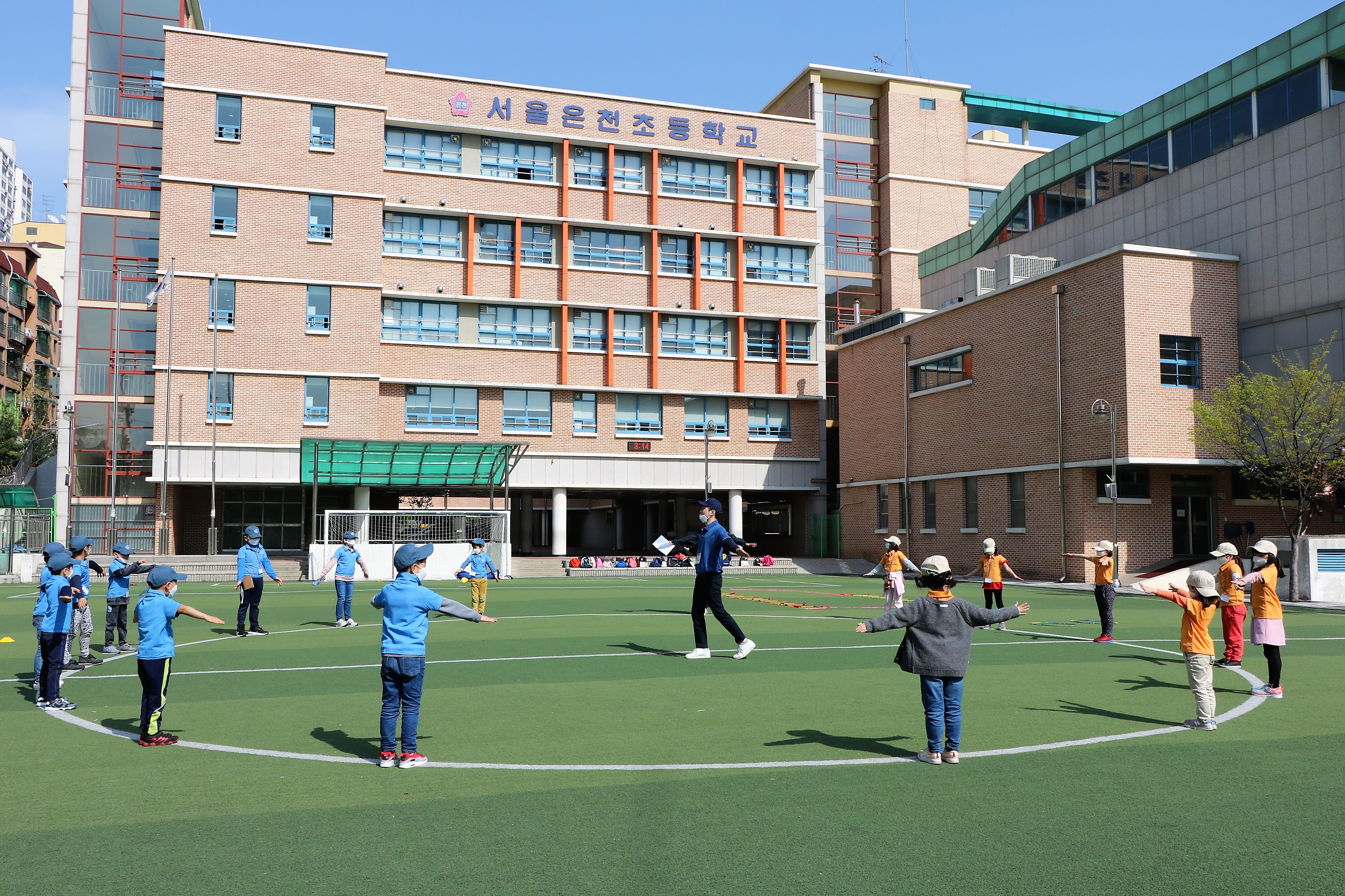 본격적으로 골프교육을 시작하기 전에 둥글게 둘러서서 몸풀기를 하려고 준비 중인 교육생들