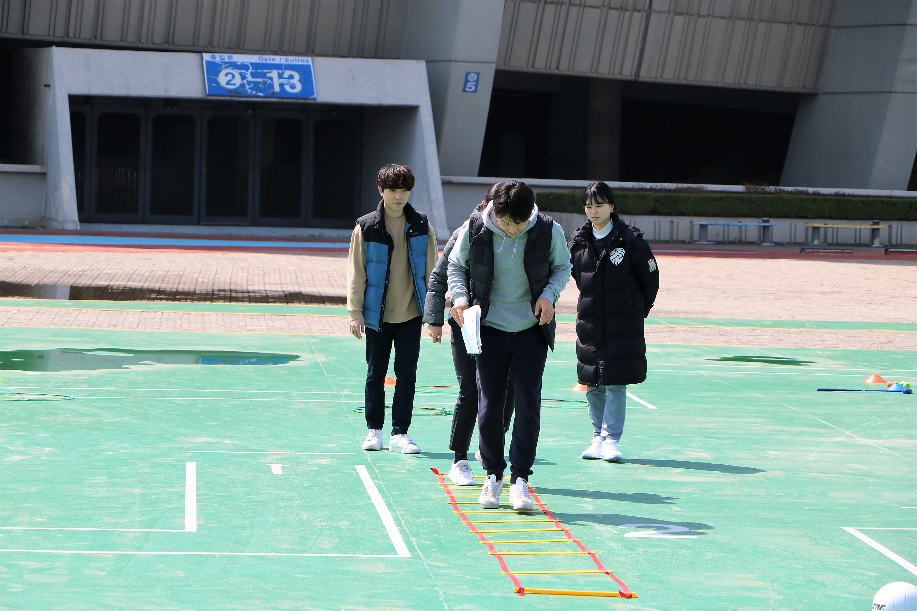 모형 기찻길을 뛰며 민첩성과 순발력을 향상시키는 동작을 실습 중인 코치들