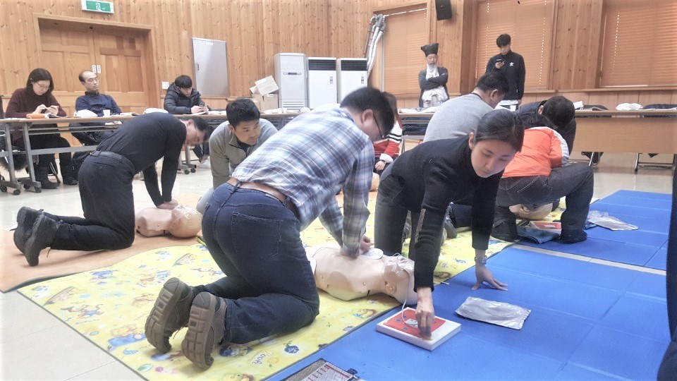 교육 도중 발생할 응급상황에 대처하기 위해 대한적십자사에서 실시하는 응급처치법 일반과정에 참여하고 있는 직원들(가슴압박 실습 중)