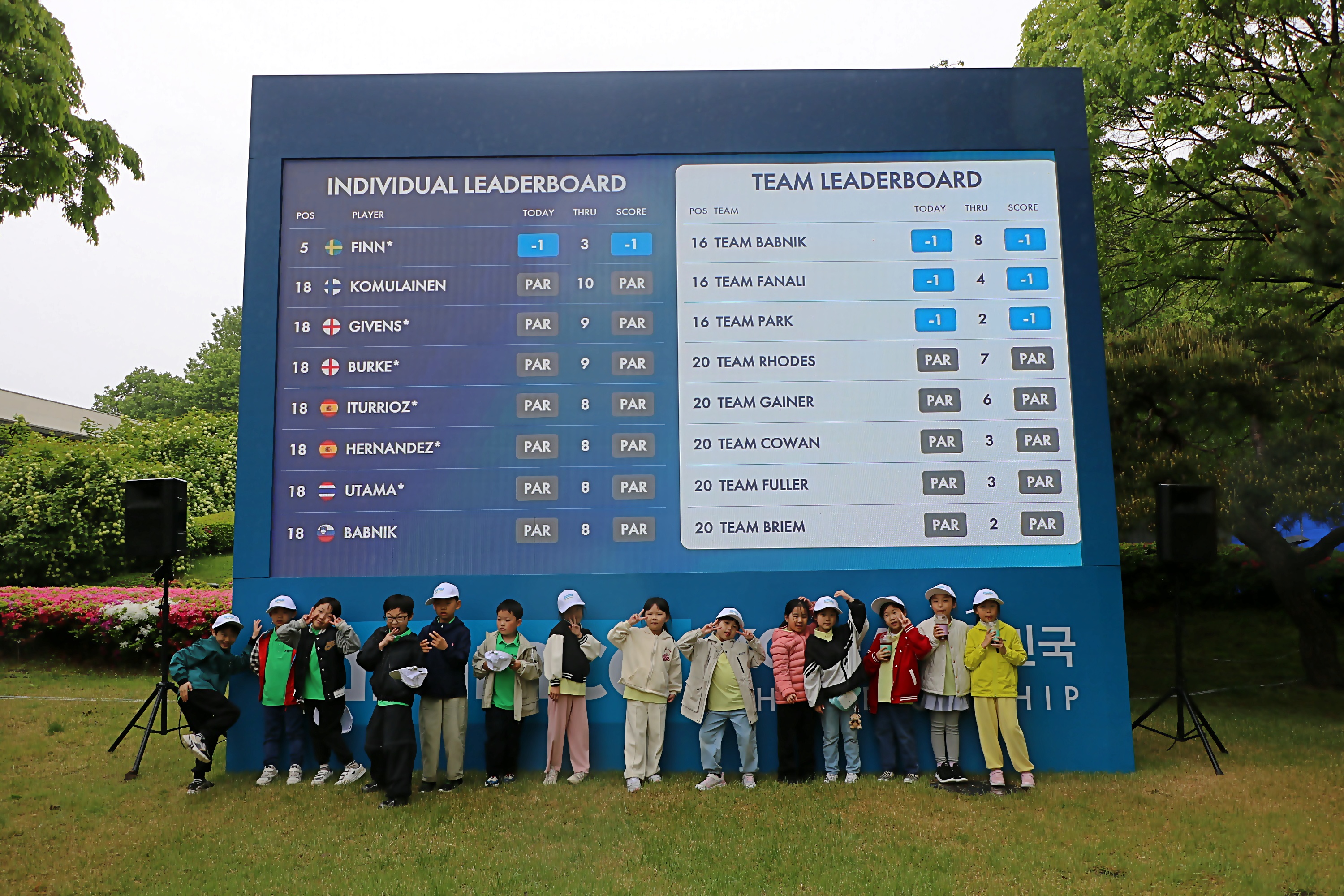 대회 리더보드 앞에 모인 오현초 꿈나무들