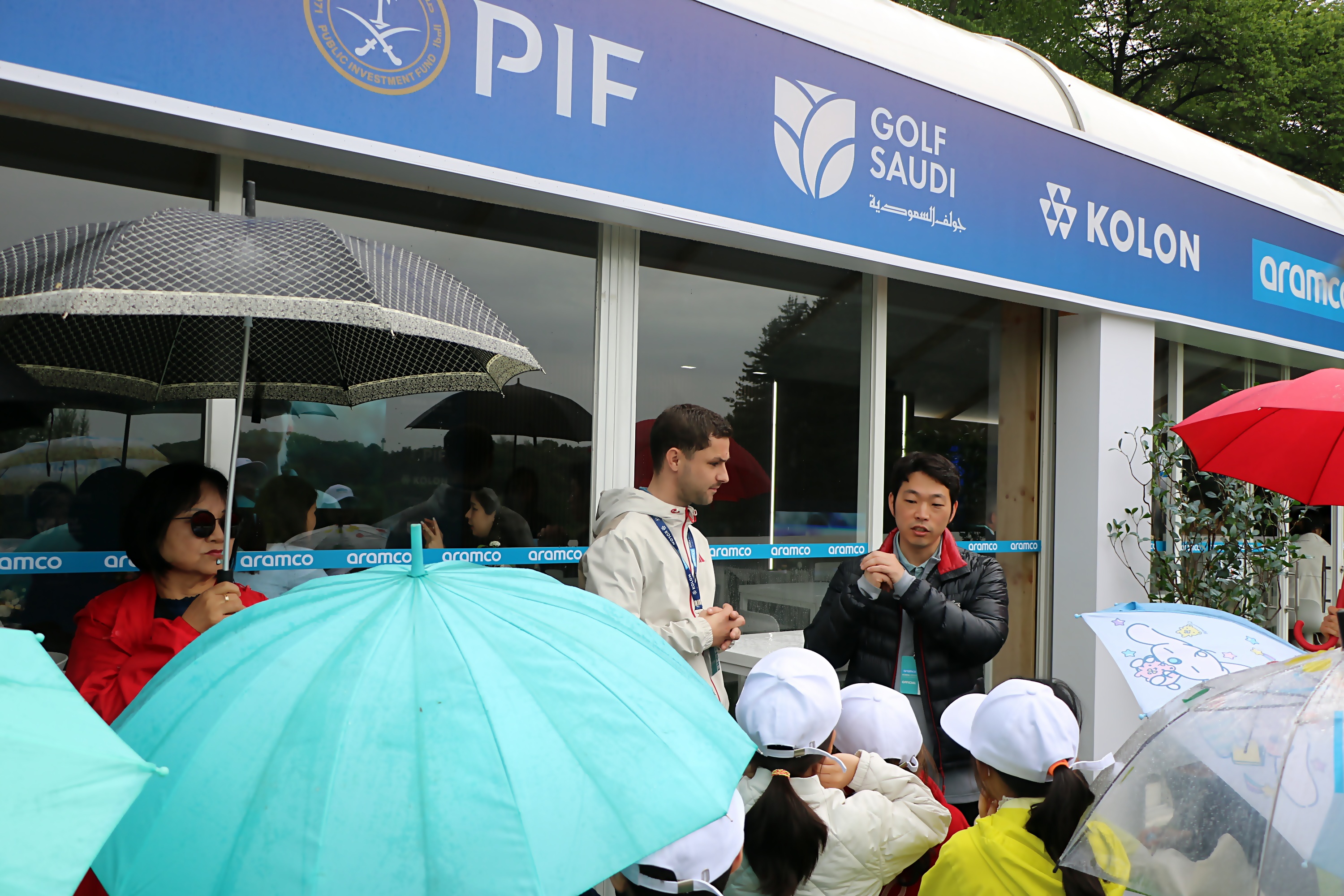 18번홀 그린주변에 설치된 호스피텔리티를 견학하고 있는 아이들