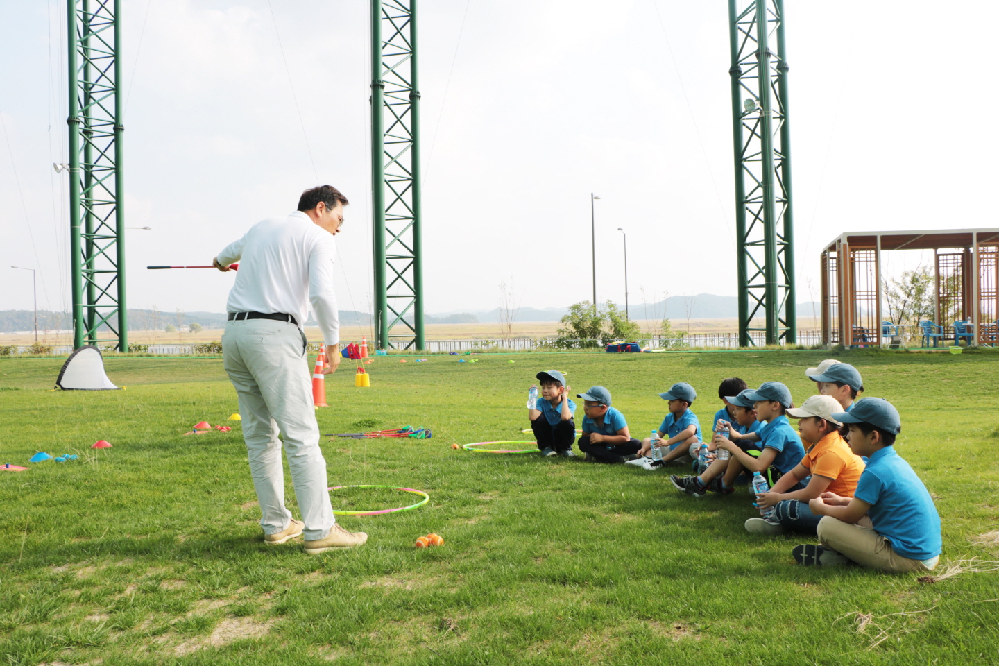 골프스윙 실전연습을 하기에 앞서 볼을 칠 방향과 목표지점에 대한 설명을 듣고 있는 교육생들
