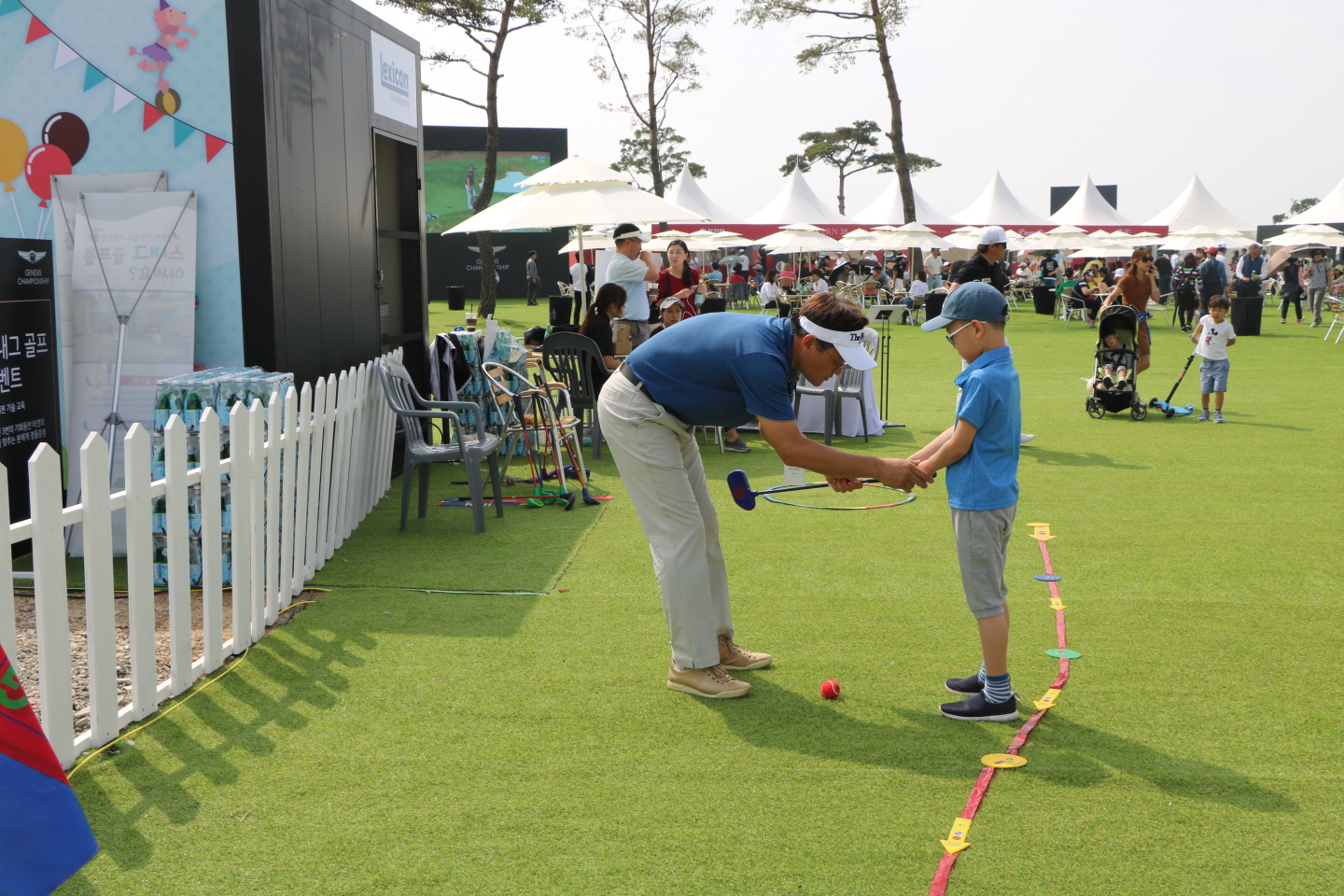 첫홀 퍼트를 하기에 앞서 코치에게 그립잡는 요령에 대해 설명듣고 있는 교육생
