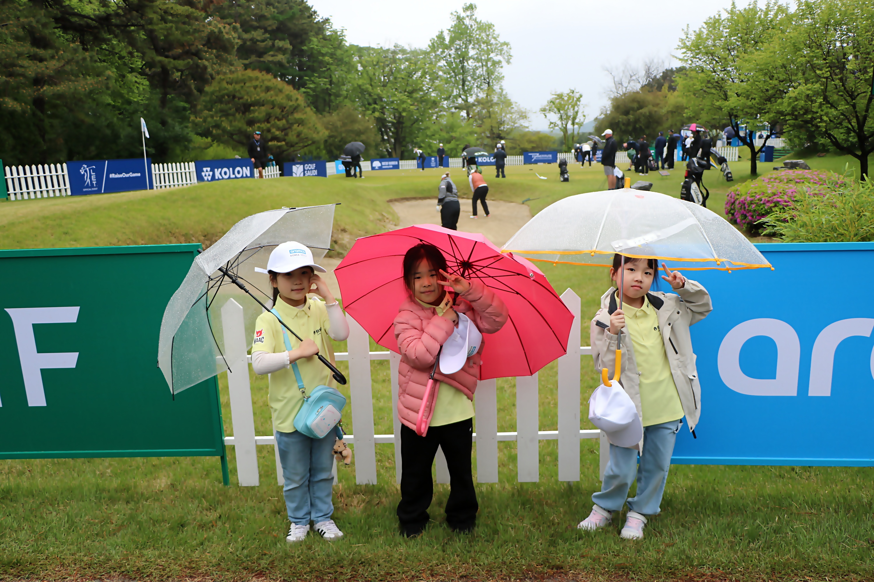 연습그린에서 선수들이 경기 시작하기 전 연습하는 모습을 지켜보고 있는 아이들