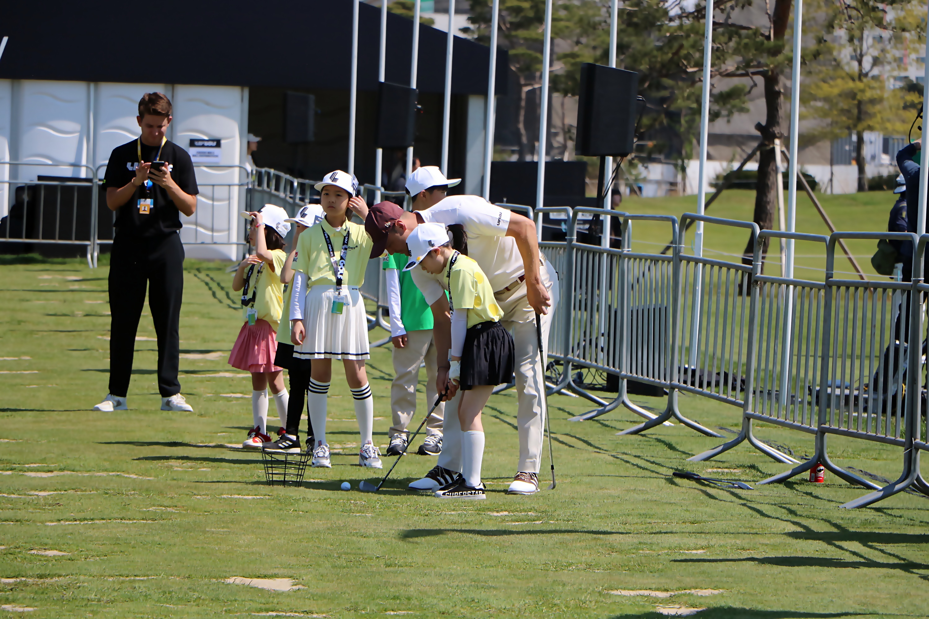 자상하게 아이들에게 칩샷레슨을 해주는 MARTIN KAYMER 선수