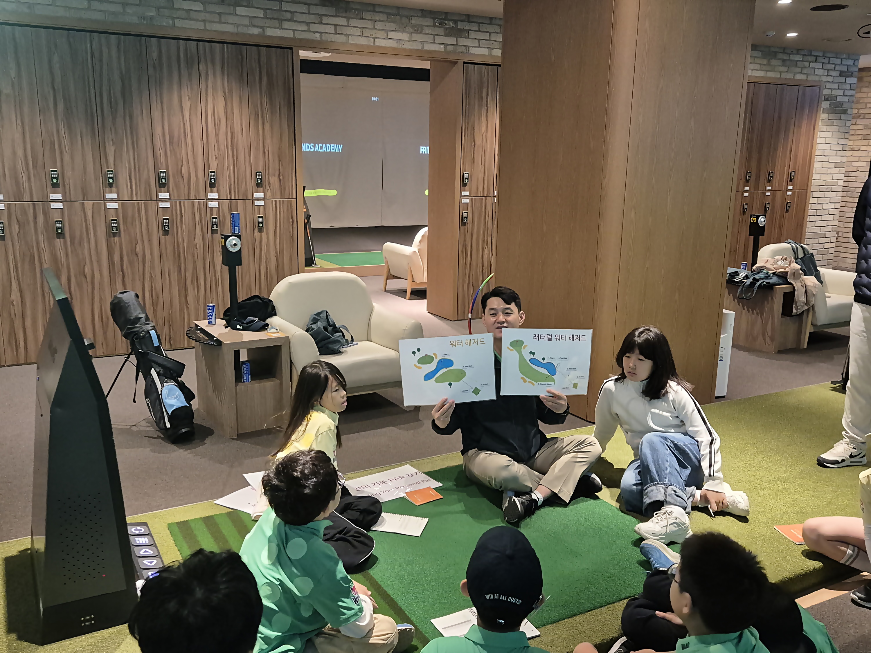 워터헤저드의 종류와 플레이 도중 친 볼이 헤저드에 들어갔을 때 처리하는 요령에 대해 설명해 주고 있는 모습