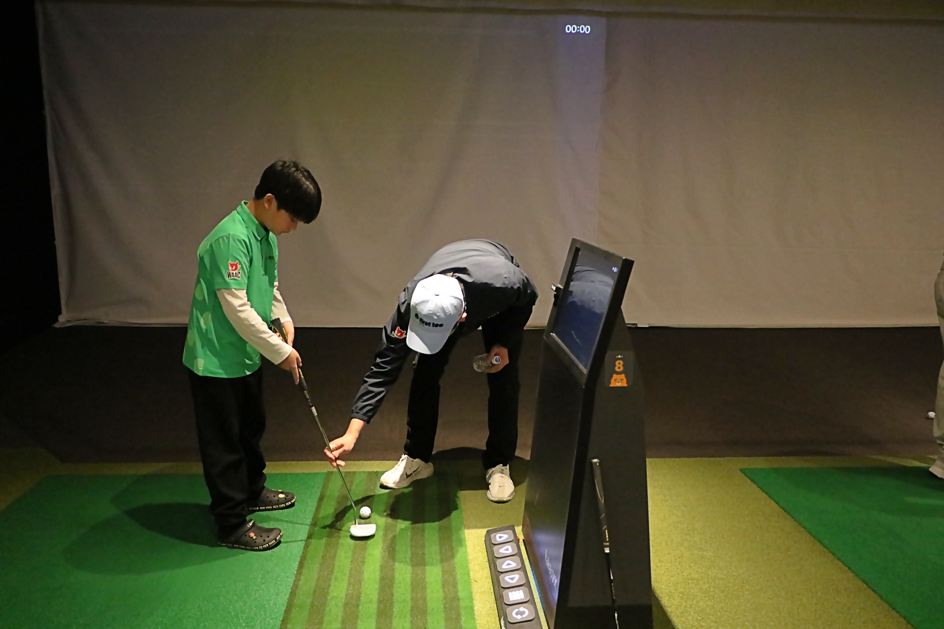 자율골프실습시간에 퍼팅하는 요령에 대해서 설명해 주고 있는 모습