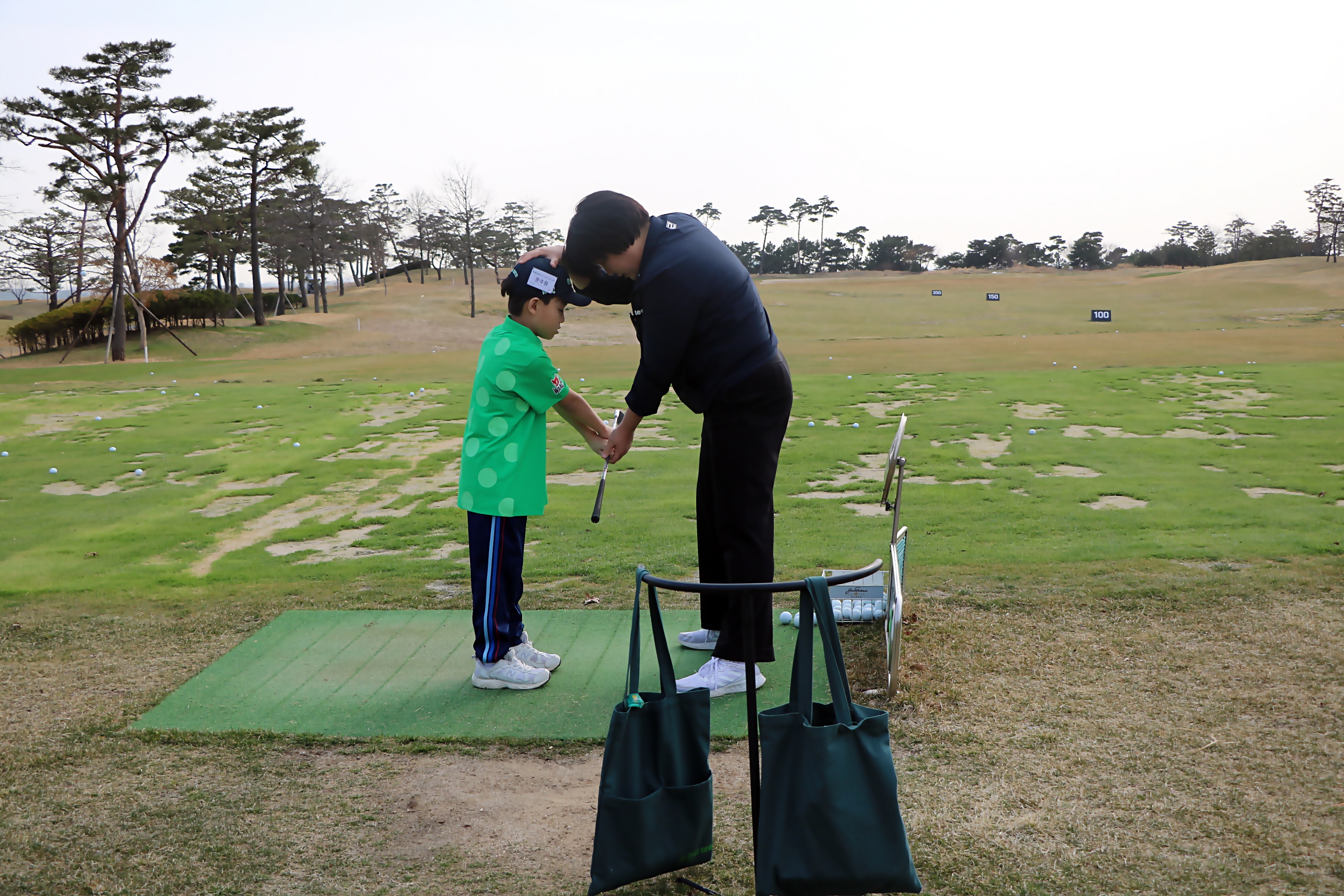 골프스윙할 때 올바른 팔동작을 취할 수 있도록 개인 밀착 레슨을 해주고 있는 모습