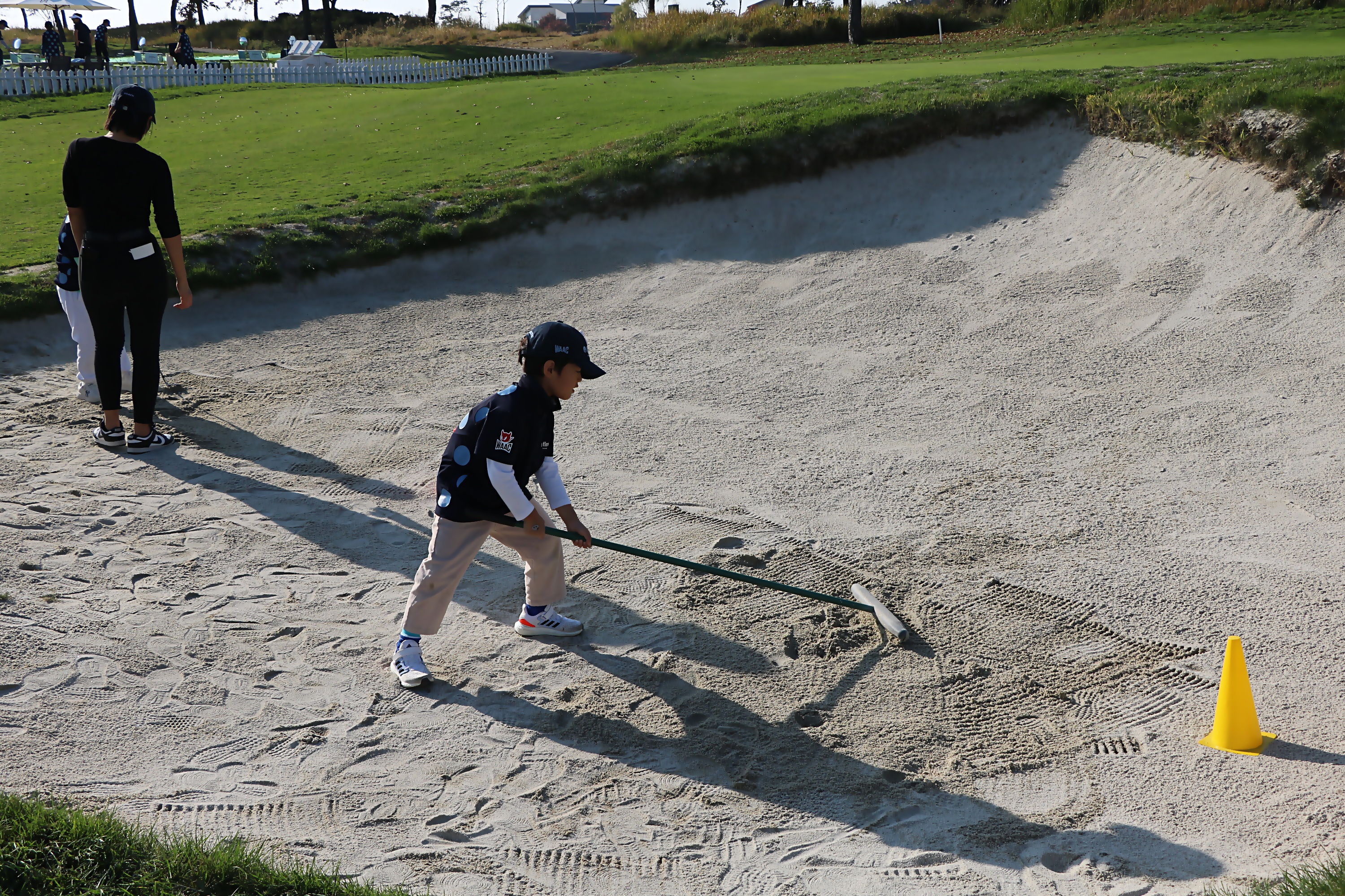 자신이 연습한 자리를 벙커에서 나오기 전에 고무레로 정리하고 있는 모습