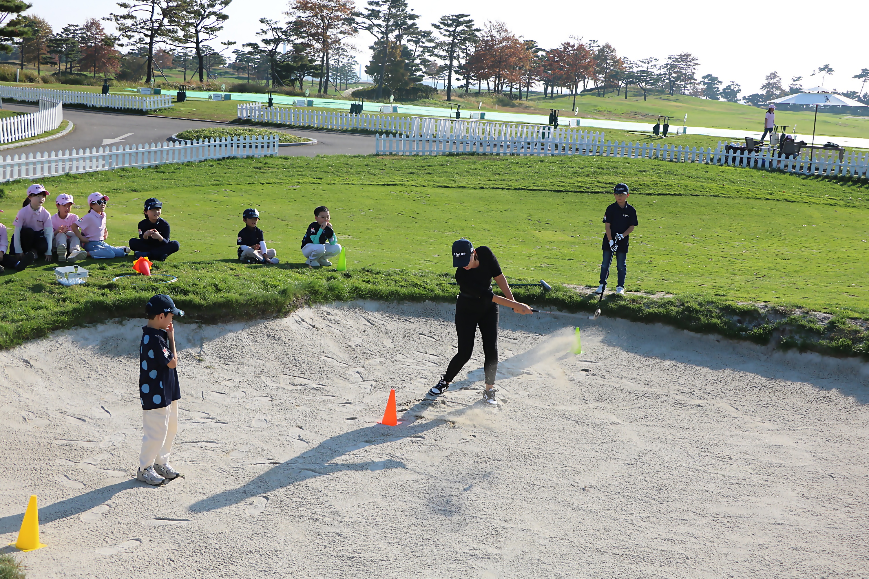 현재 자신의 기분상태를 모래 위에 그린 뒤 이것을 지우는 벙커샷 시범