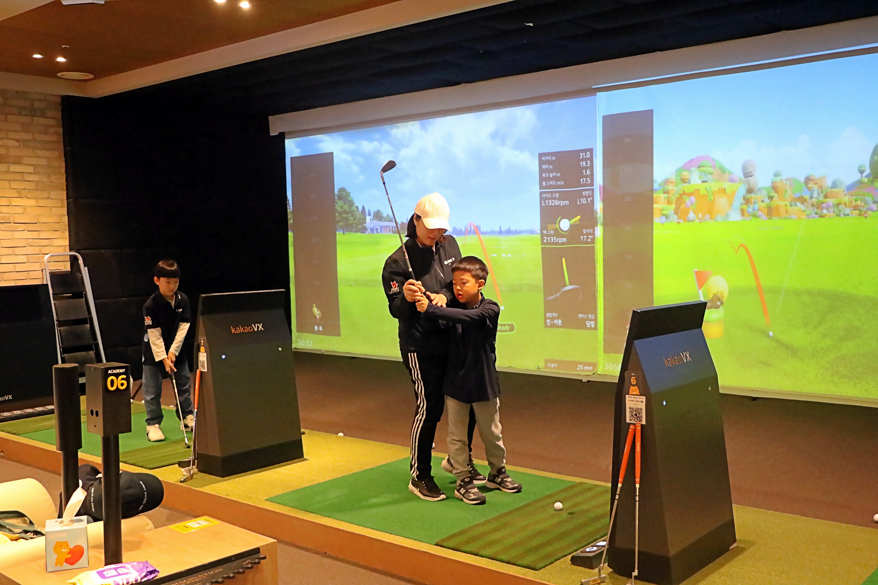 백스윙시 왼팔의 팔꿈치가 자꾸 굽어지는 문제점을 교정해 주고 있는 모습