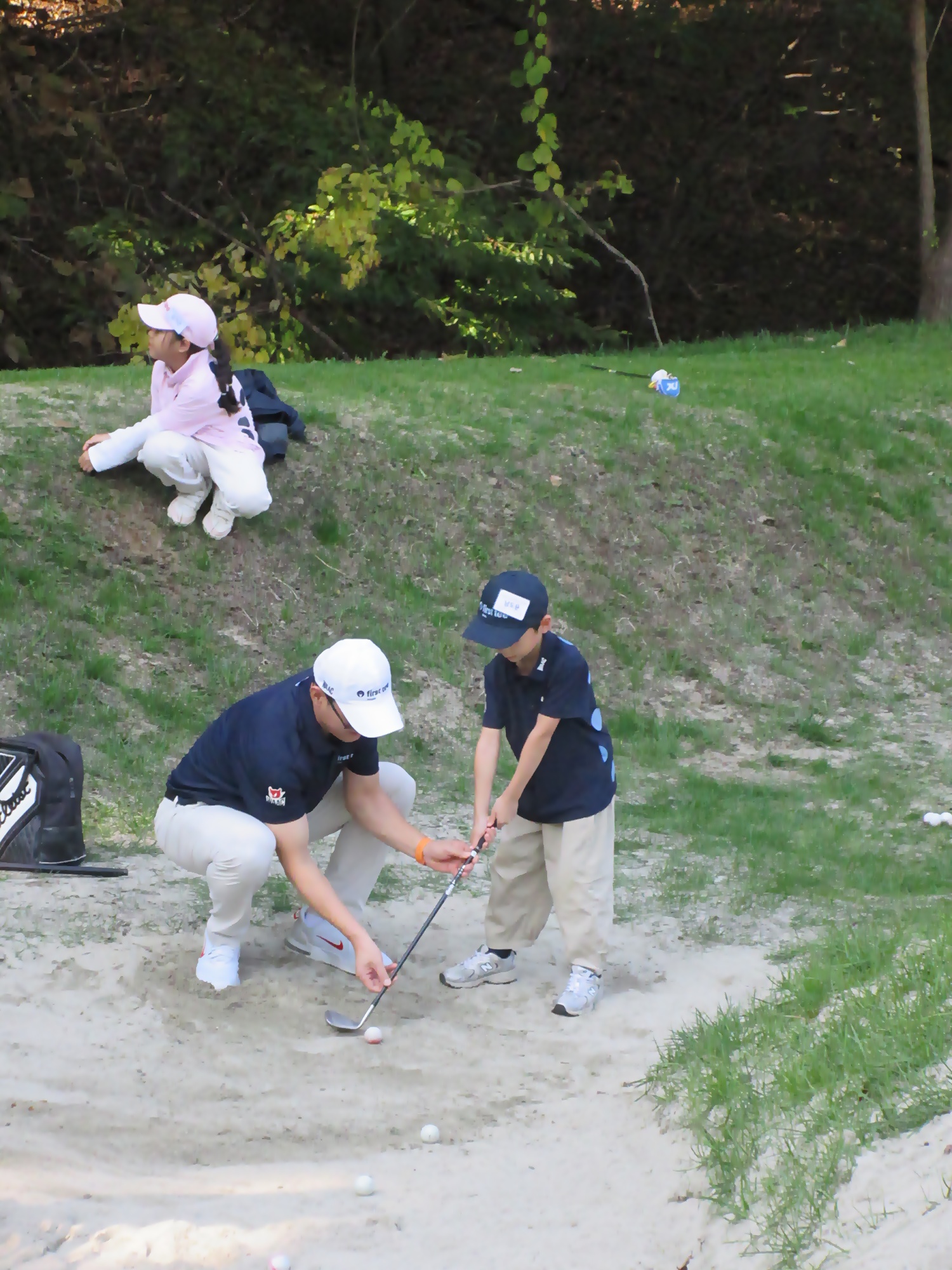 벙커샷은 일반샷할 때와는 다르게 클럽헤드의 페이스 방향이 열려 있어야 함을 알려주고 있는 모습