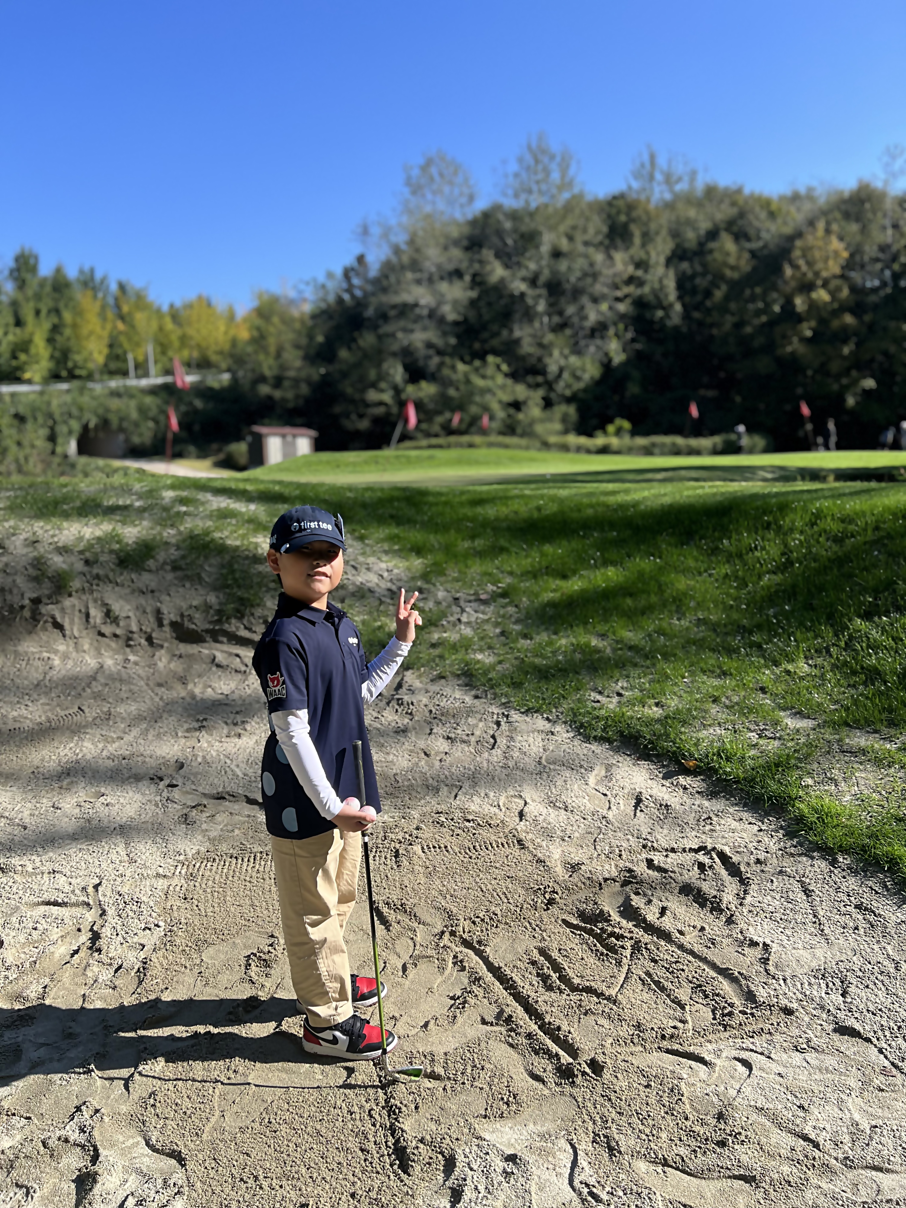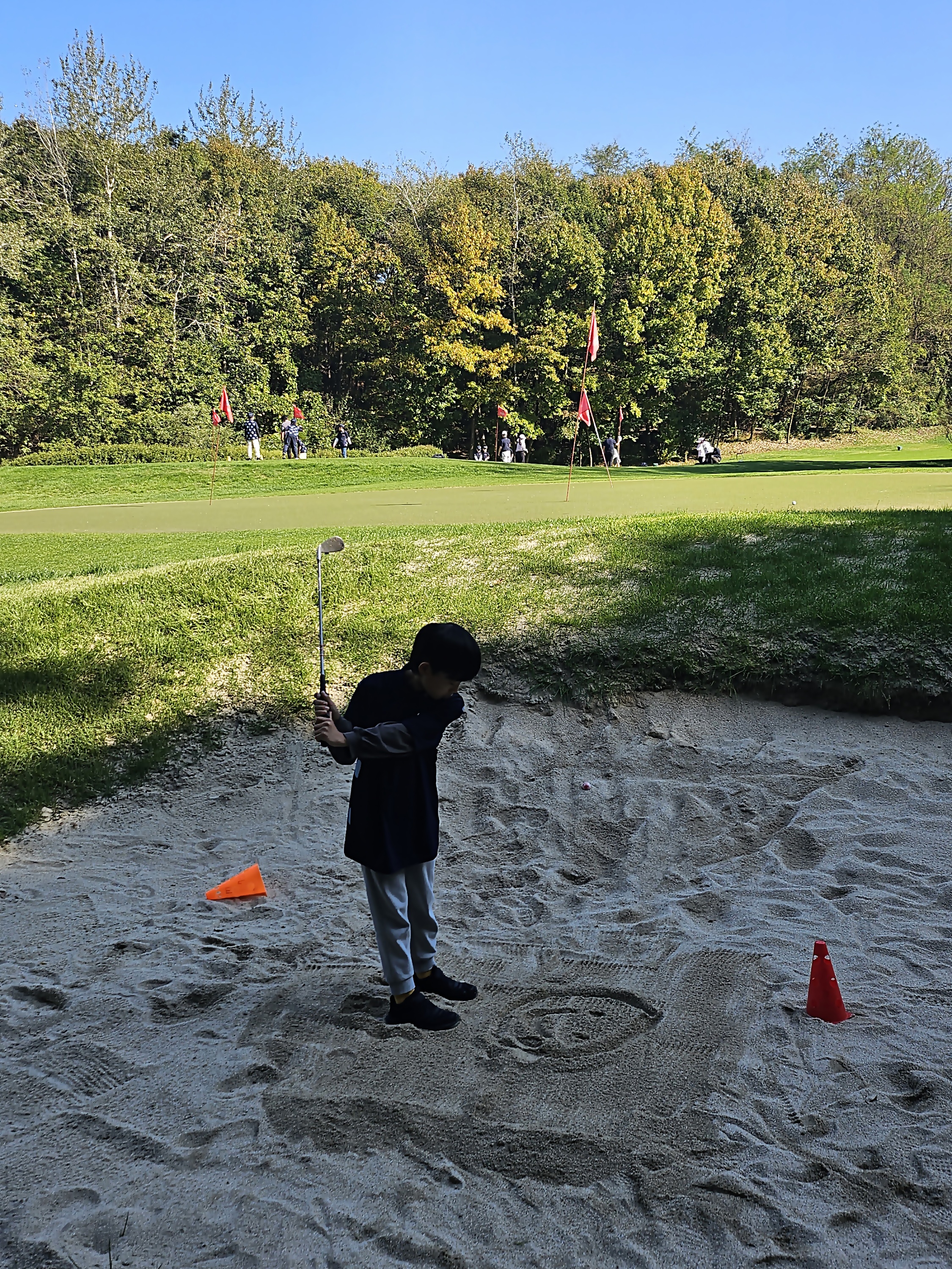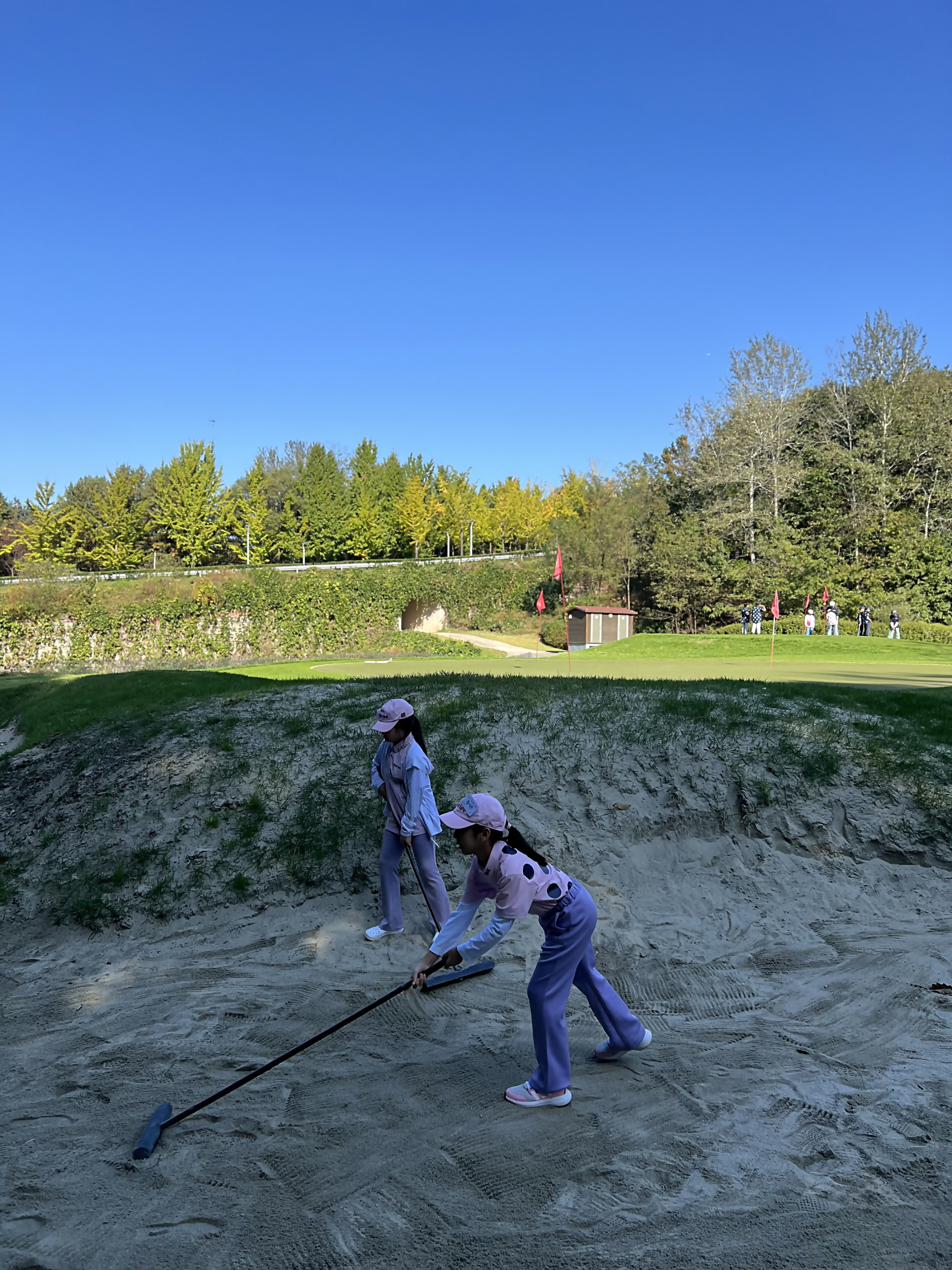 벙커샷 연습을 한 뒤 자신의 발자국 등이 새겨진 모래를 스스로 정리하는 아이들 모습