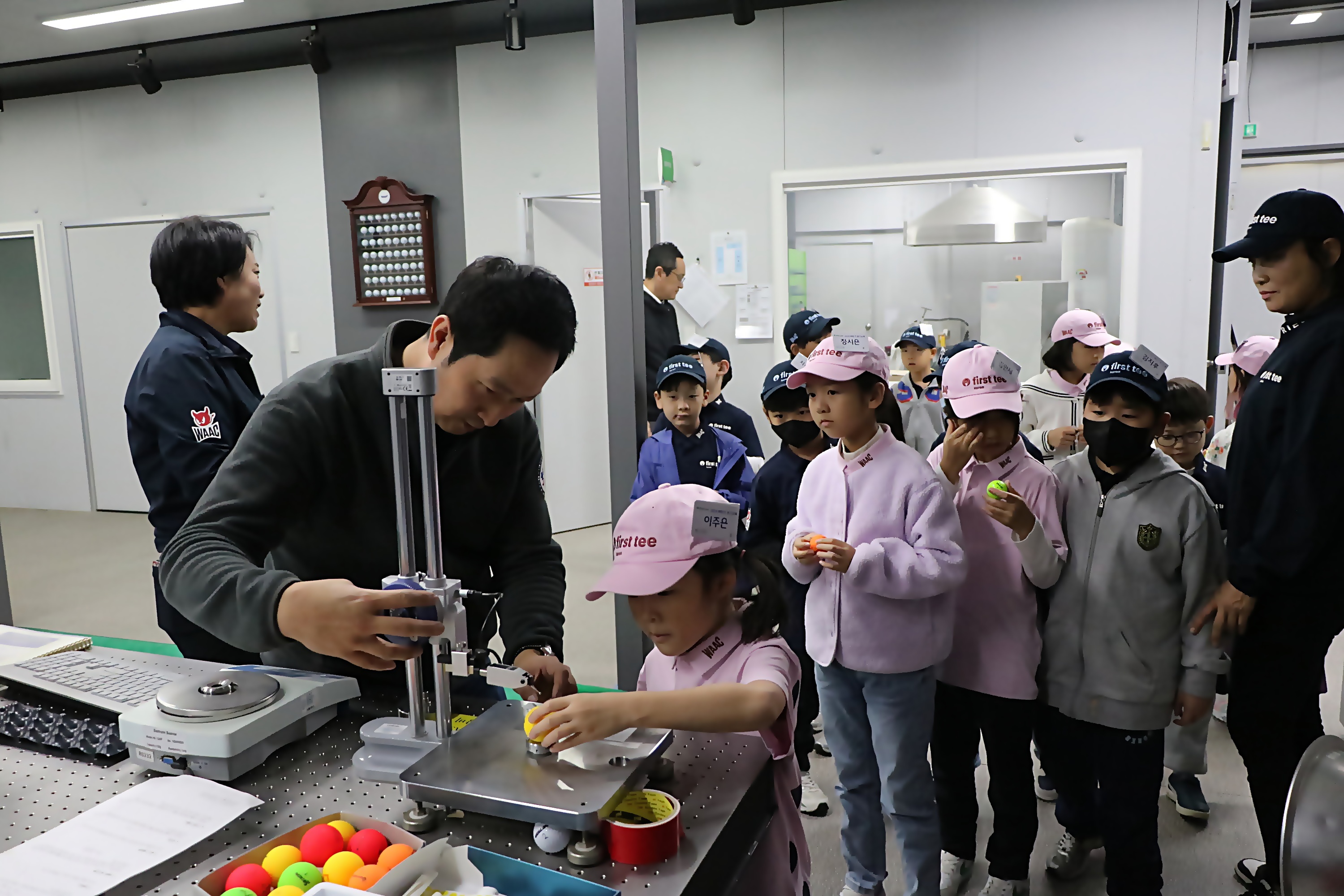 정밀 기계로 볼의 크기를 직접 측정해 보고 있는 아이들
