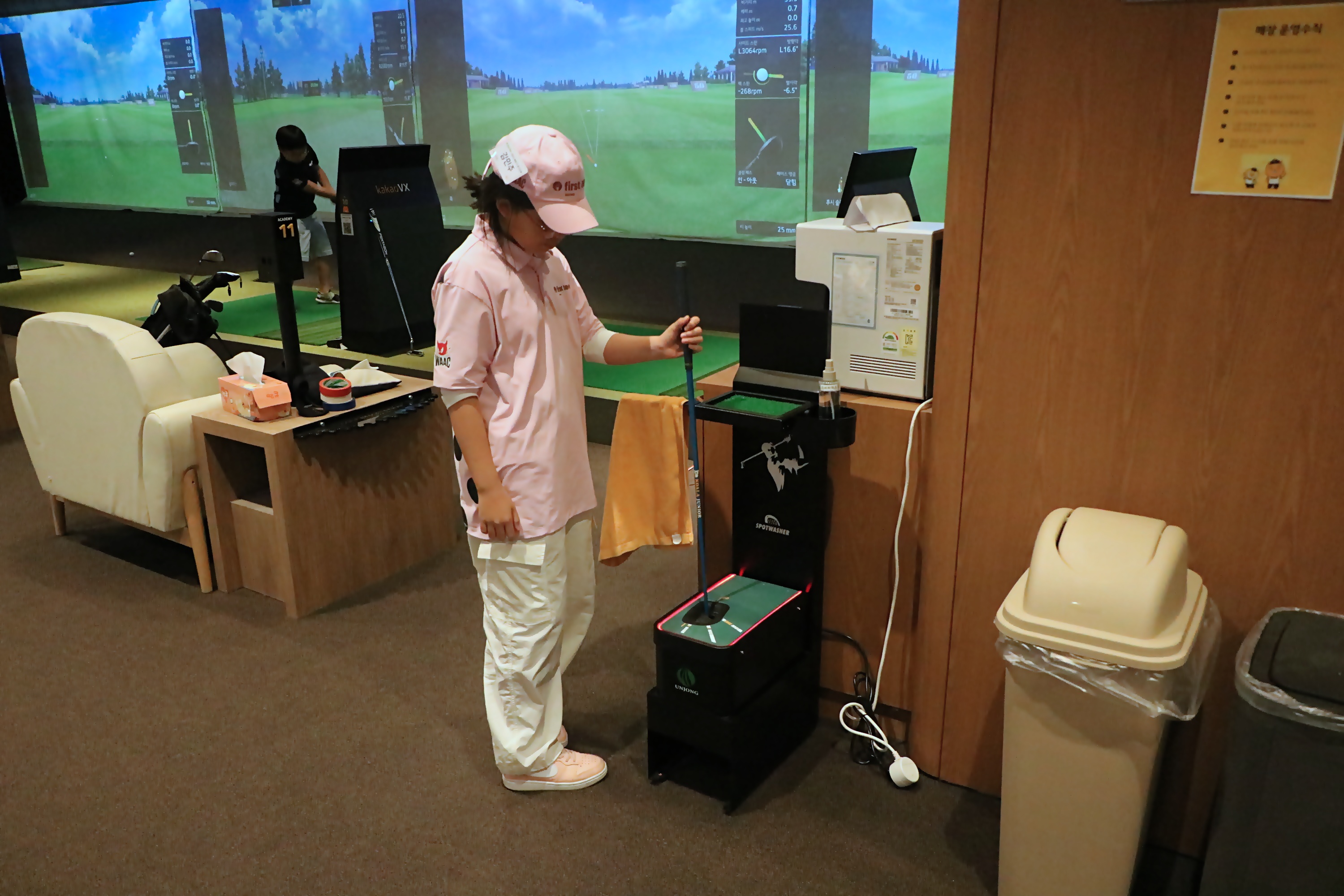 자신이 사용한 골프클럽을 다음에 사용할 사람을 위해 깨끗하게 세척하고 있는 모습