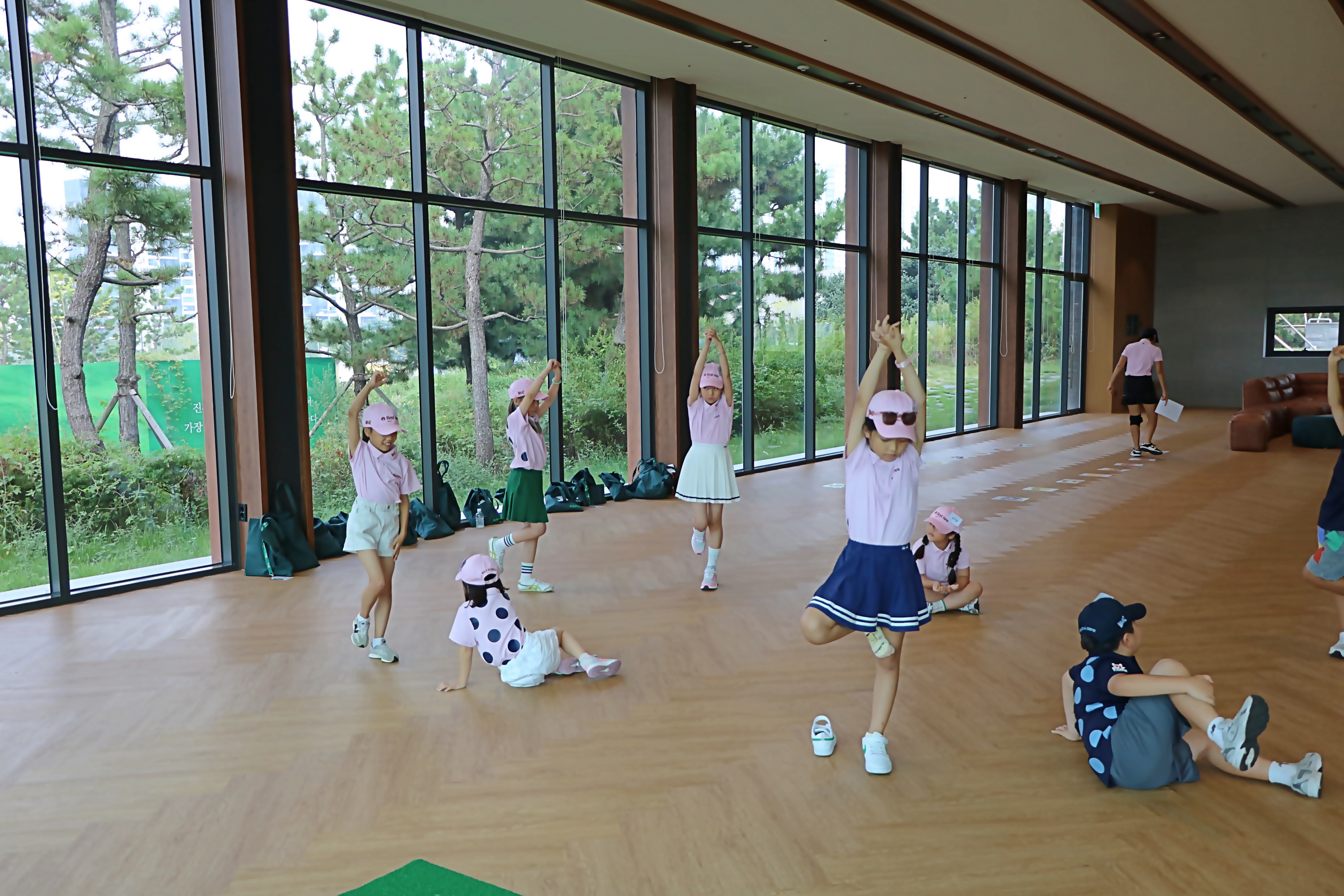 코치님과 함께 한발로 누가 오래 더 버티는지를 하면서 균형감각을 기르고 있는 아이들