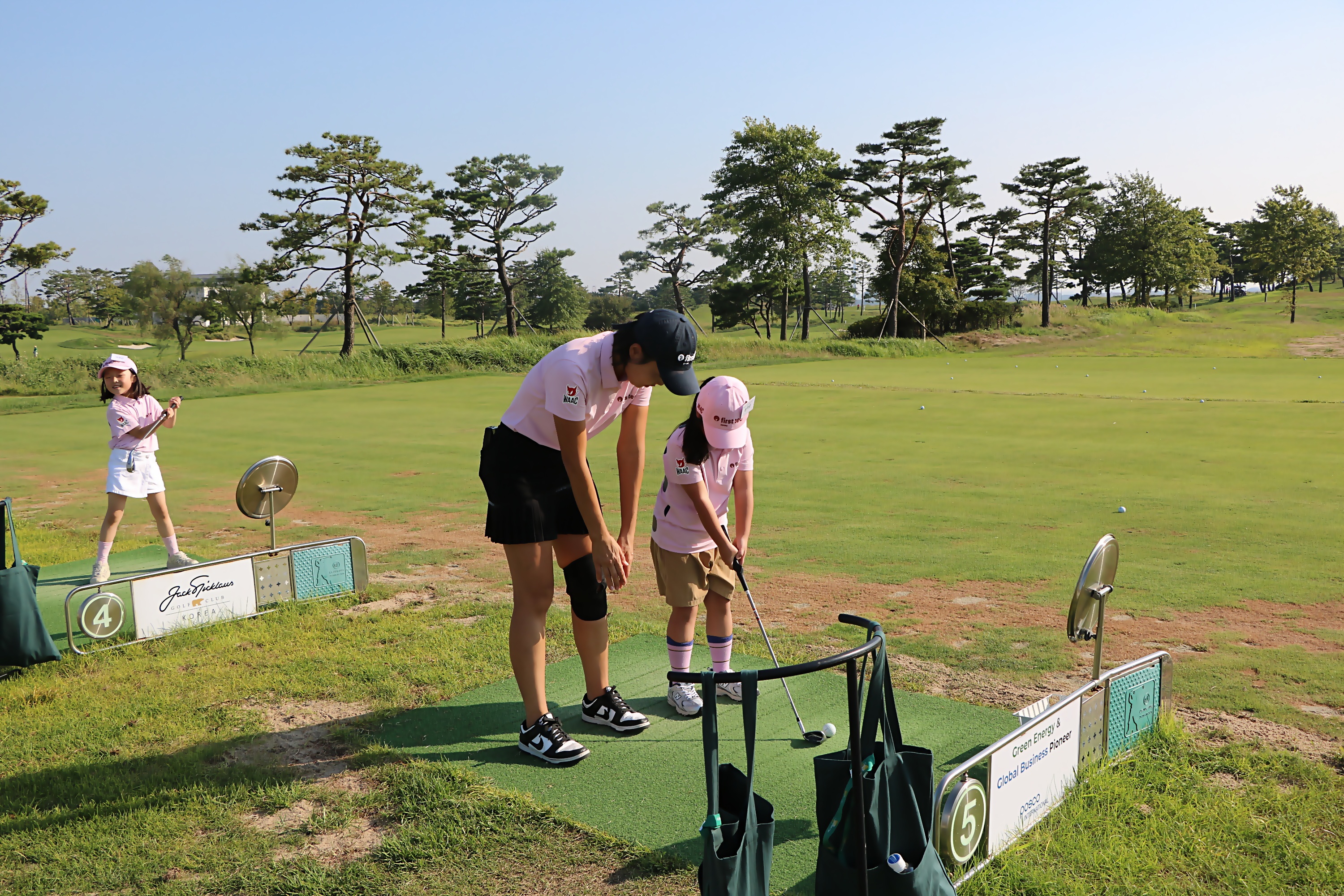 어드레스시 어깨 넓이만큼 양발간격을 서도록 지도해 주고 있는 모습