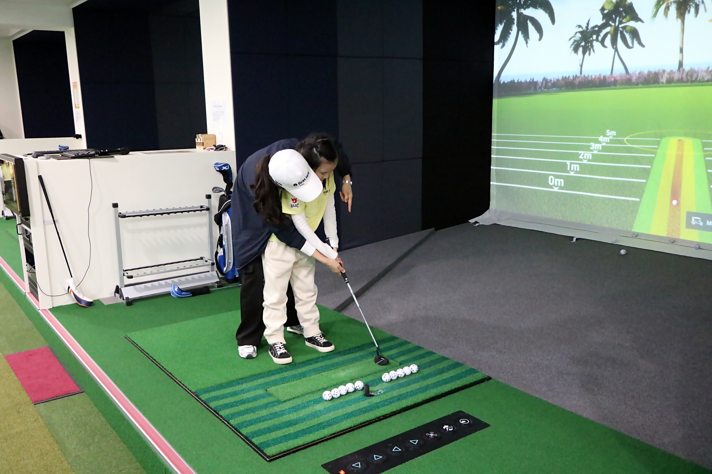 스윙 크기를 적절하게 할 수 있도록 골프볼을 놓고 지도하는 모습