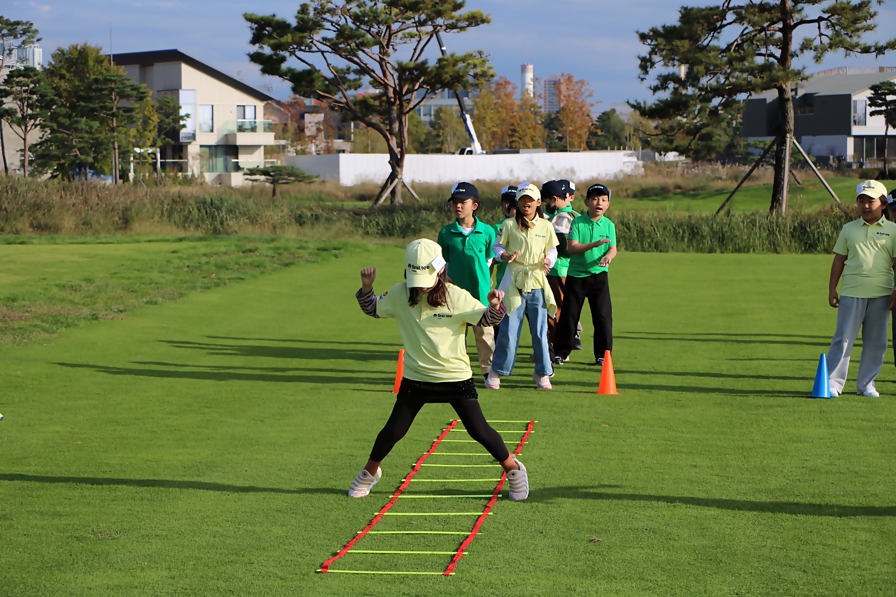 순발력 등을 키우기 위해 두팀으로 나뉘어 기찻길 게임을 하고 있는 아이들