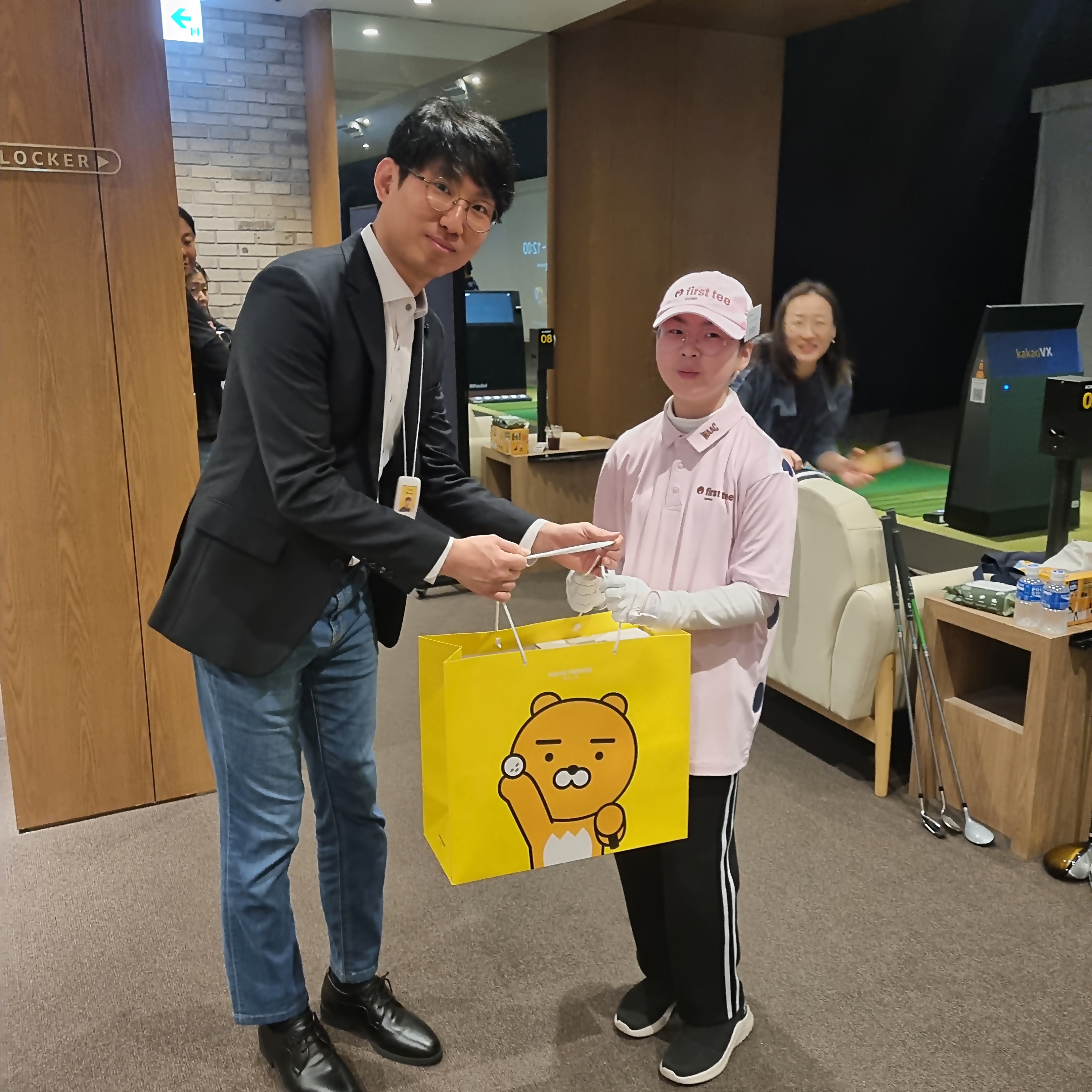 자신의 스윙을 카카오 VX의 AI 시스템에 학습시키는 체험을 한 뒤 참가기념품을 받고 기뻐하는 교육생