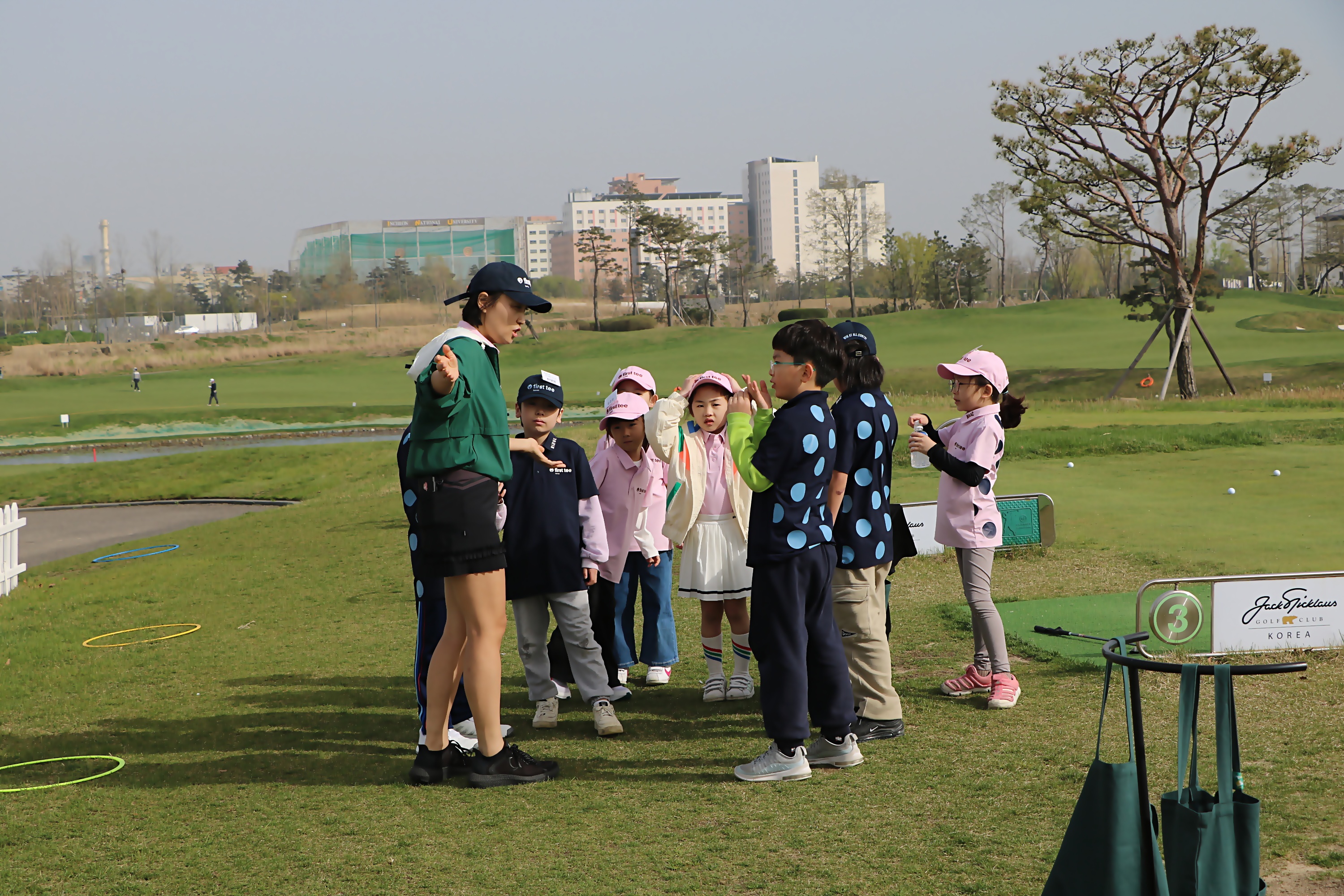 골프실습할 때 타석에서 벗어나 이동할 경우 안전하게 다니는 방법에 대해서 반복적으로 가르쳐주고 있는 모습