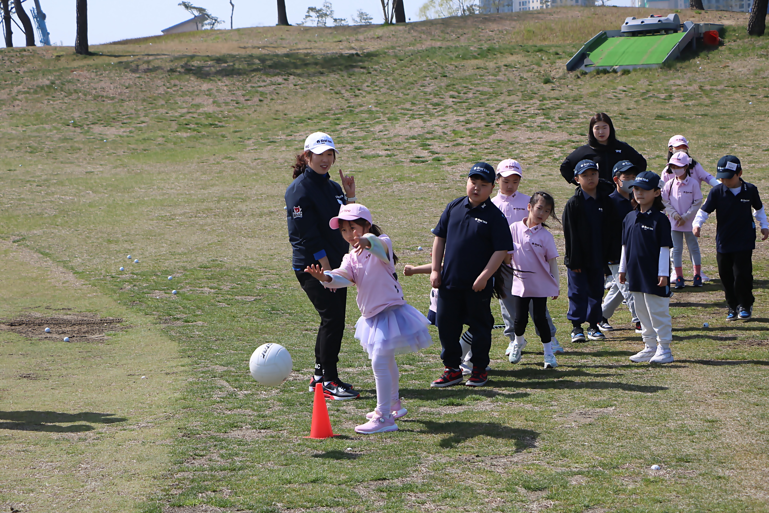 골프스윙의 리듬감을 익히기 위한 놀이로 2팀으로 나뉘어 배구공 볼링을 하고 있는 아이들