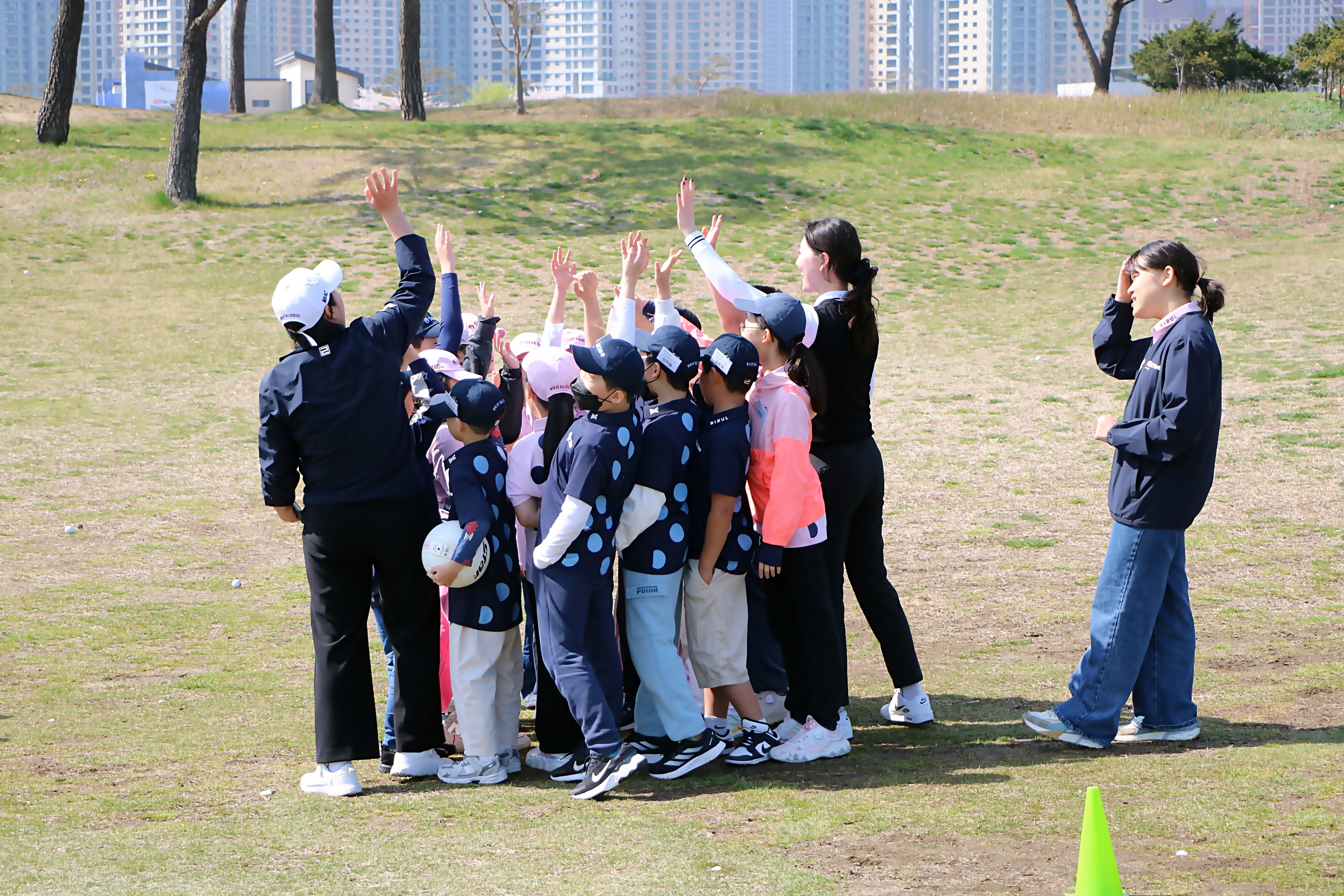 코치님과 함께 화이팅을 외치며 전의를 다지고 있는 아이들