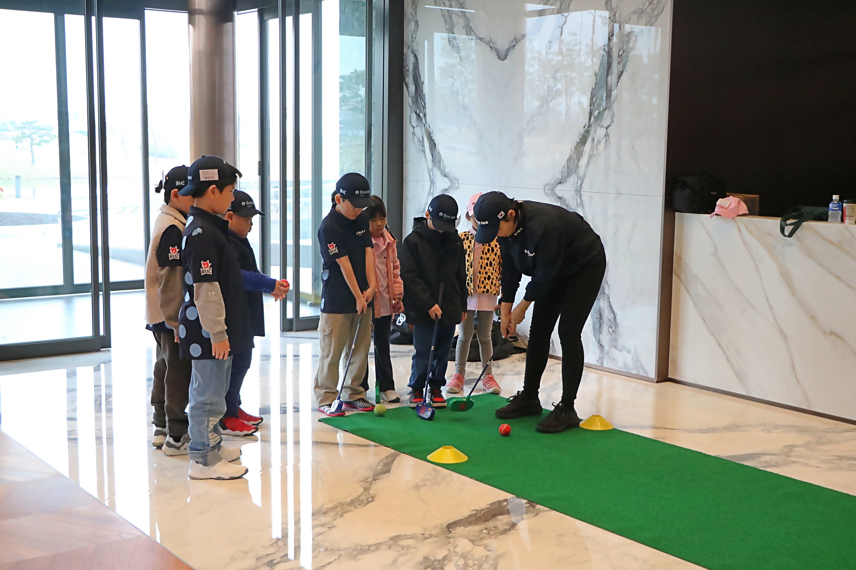 퍼팅시 두손을 모아 위에서 떨어지는 물을 받는 듯한 자세로 퍼팅을 해야 함을 설명해 주고 있는 모습