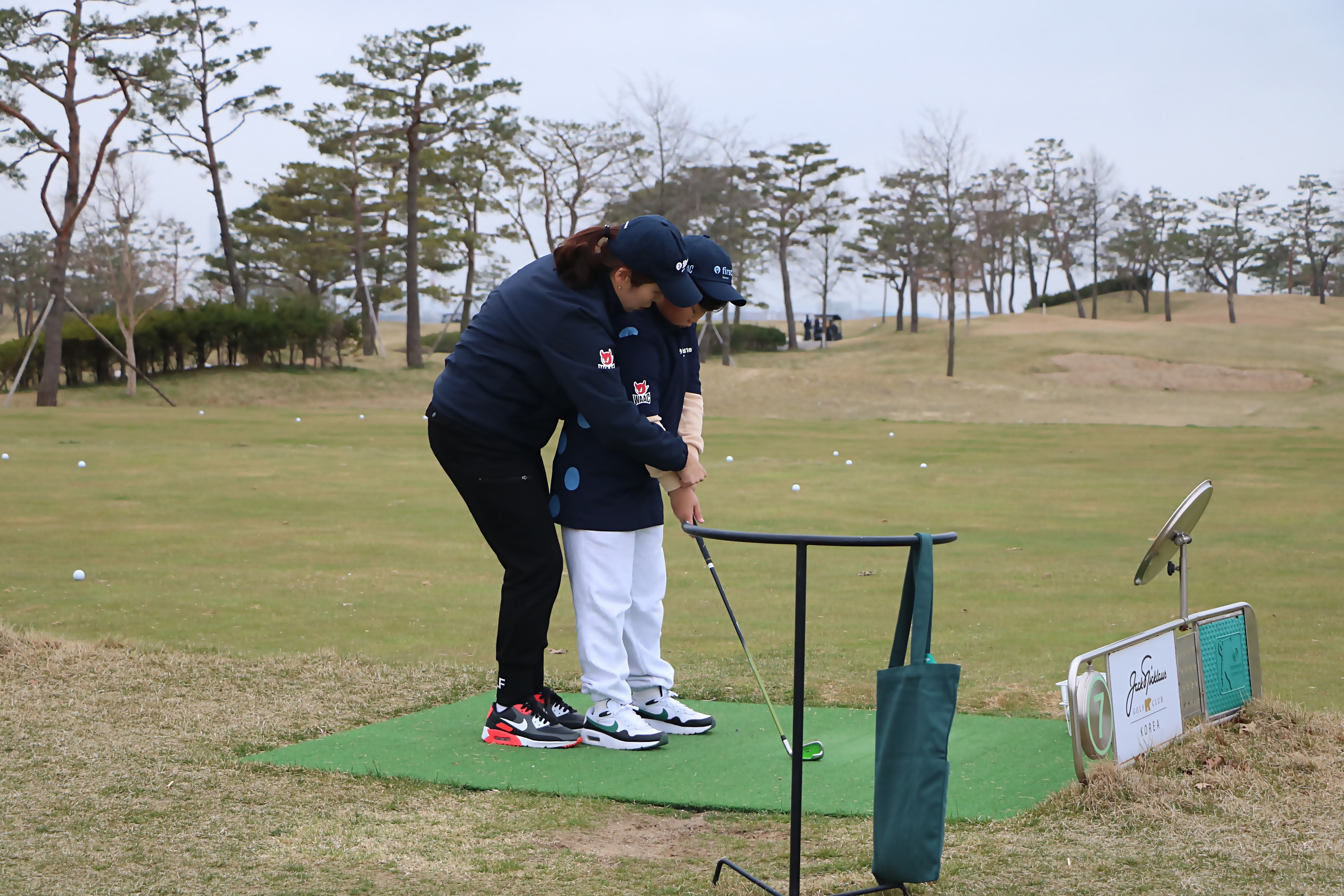 1:1로 반복적으로 올바른 어드레스 자세를 가르쳐 주고 있는 모습