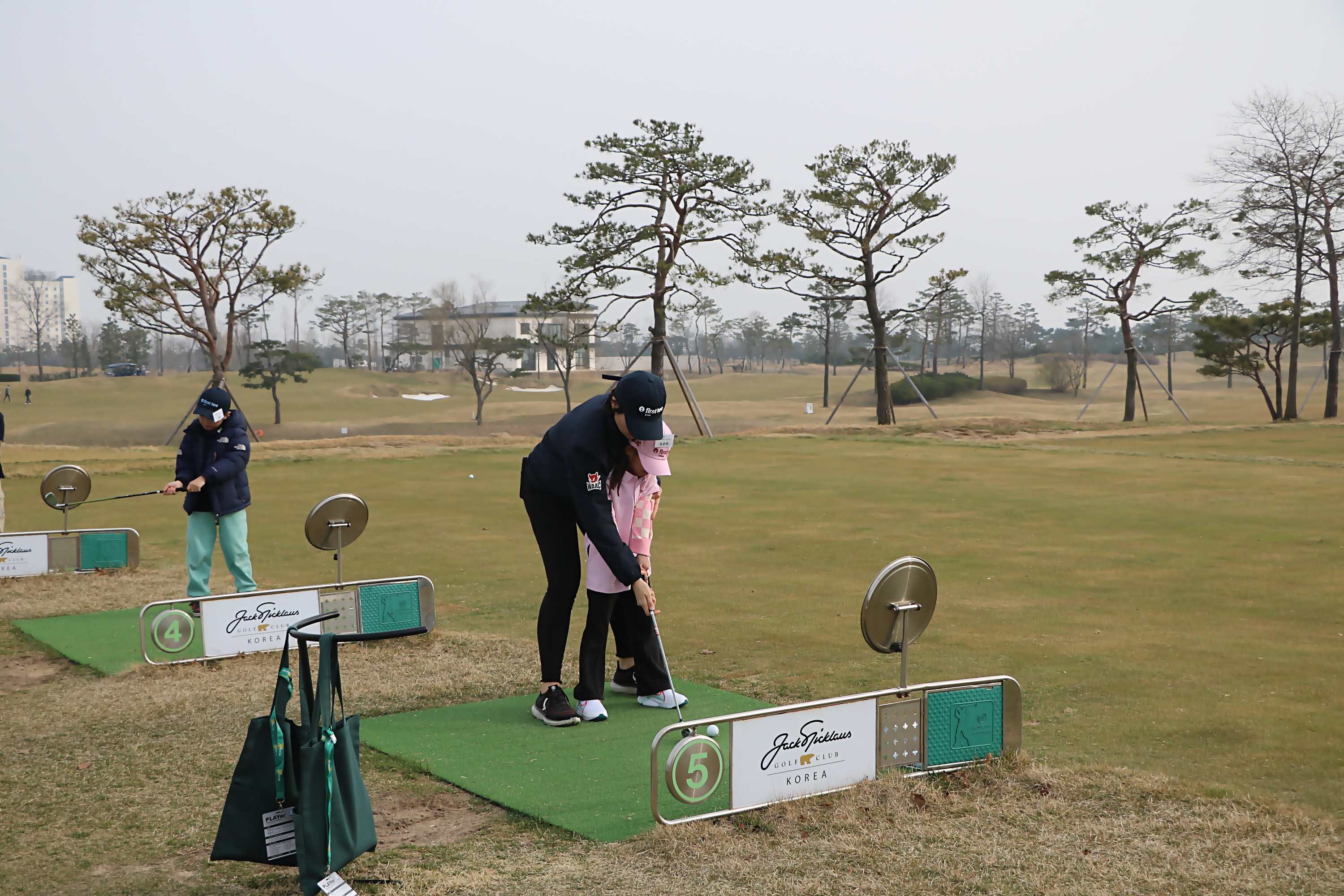 1:1로 어드레스 자세시 볼위치와 양발 간격 등을 올바르게 교정해 주고 있는 모습