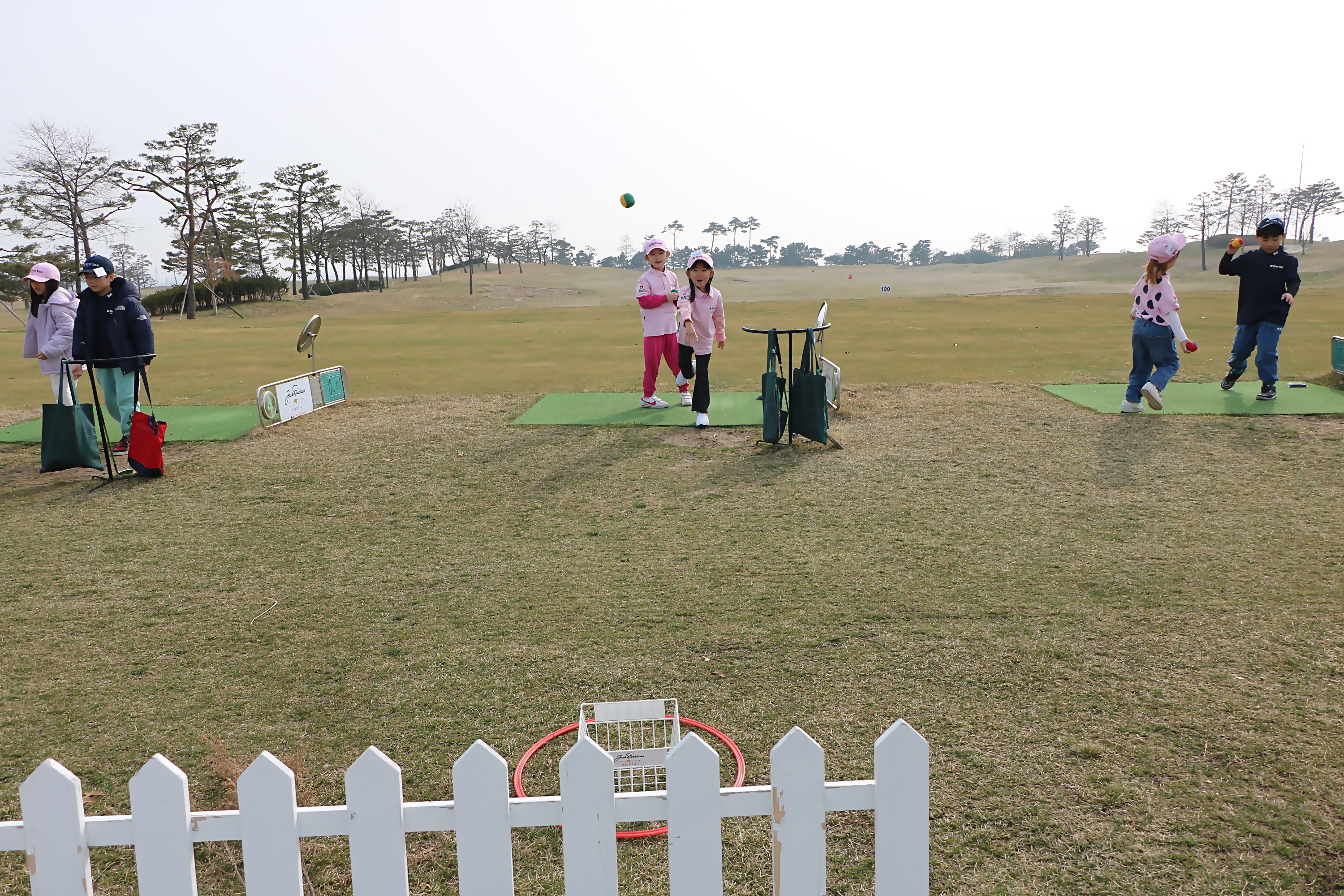 스윙 크기에 따라 공이 날아가는 비거리가 달라지는 것을 아이들이 쉽게 이해할 수 있도록 손으로 앞에 놓인 바구니에 공을 던져서 넣는 게임을 하고 있는 모습
