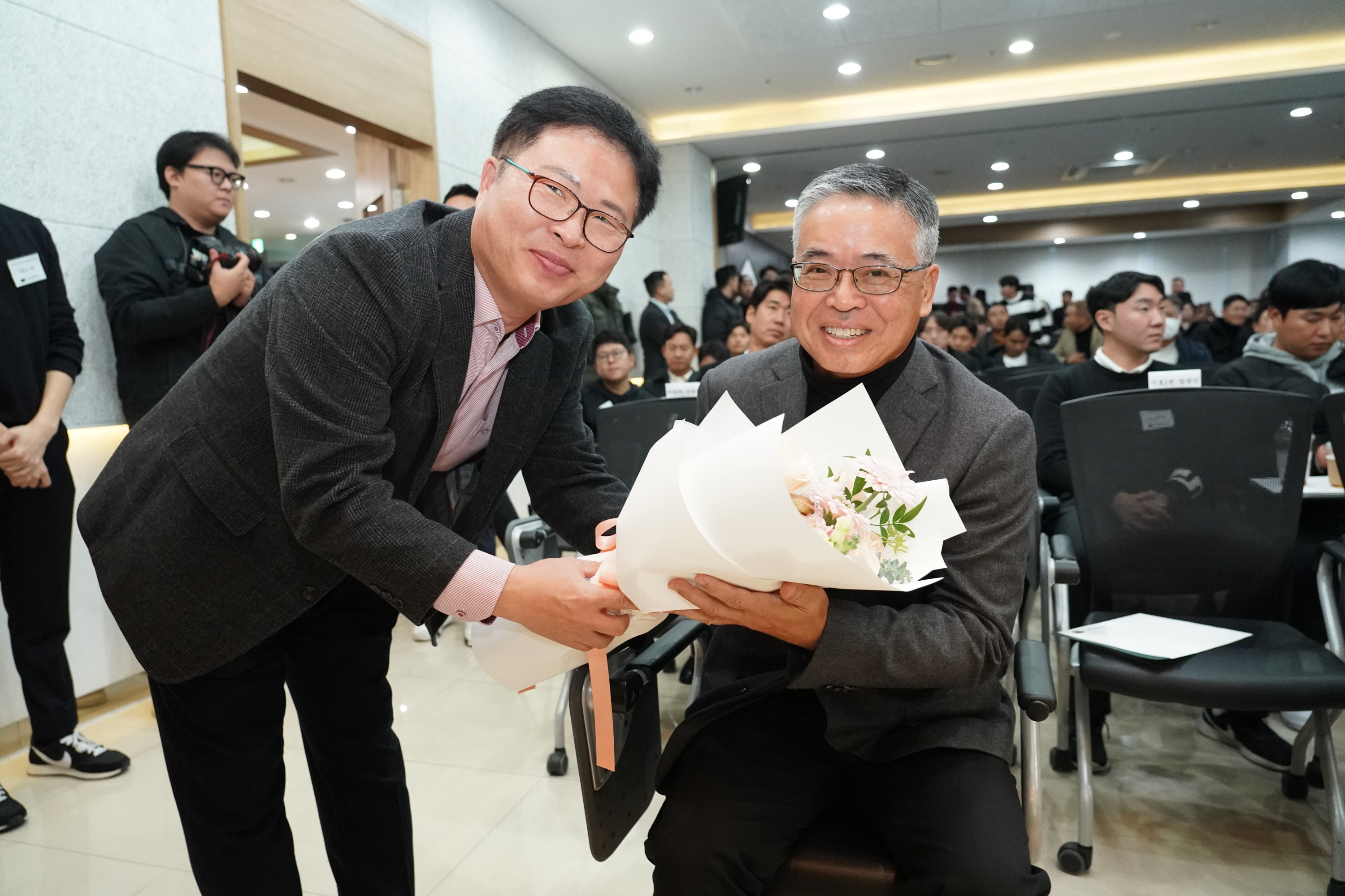 긴장 속에 치러진 개표결과, 제19대 한국프로골프협회 협회장 당선을 확정짓고 축하 꽃다발을 받으며 활짝 웃고 있는 김원섭 상임이사