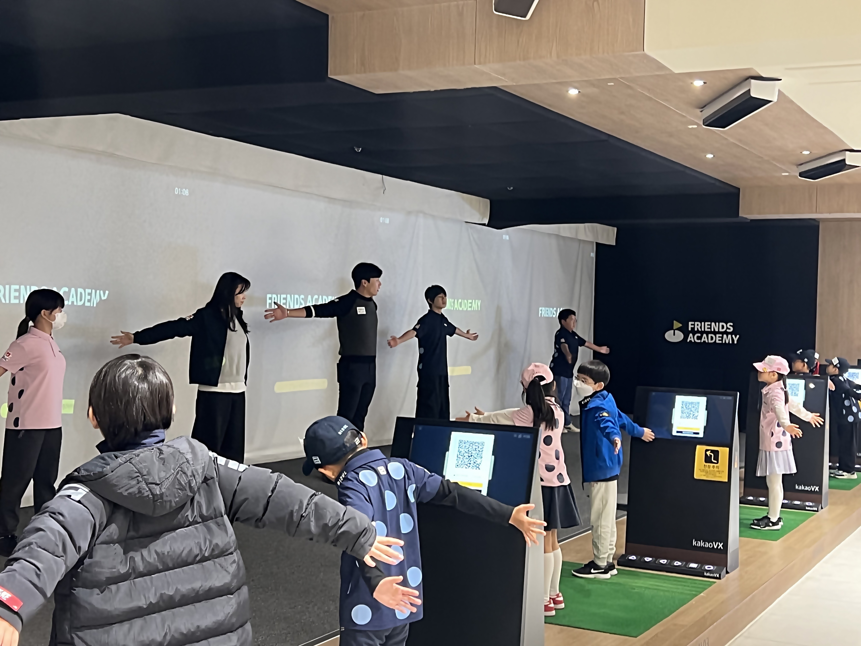 골프실습 전 부상방지를 위해 코치님의 구령에 맞춰 스트레칭을 하고 있는 아이들