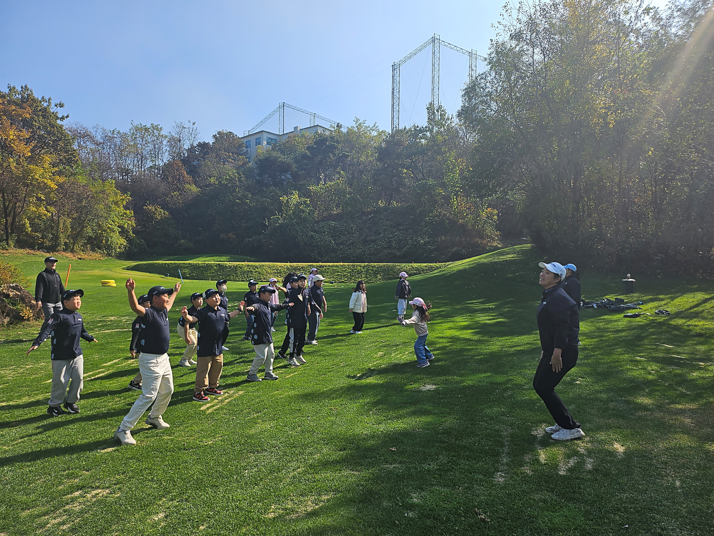 쌀쌀한 날씨로 인해 발생할 수 있는 부상방지를 위해 몸풀기를 하며 워밍업을 하고 있는 아이들