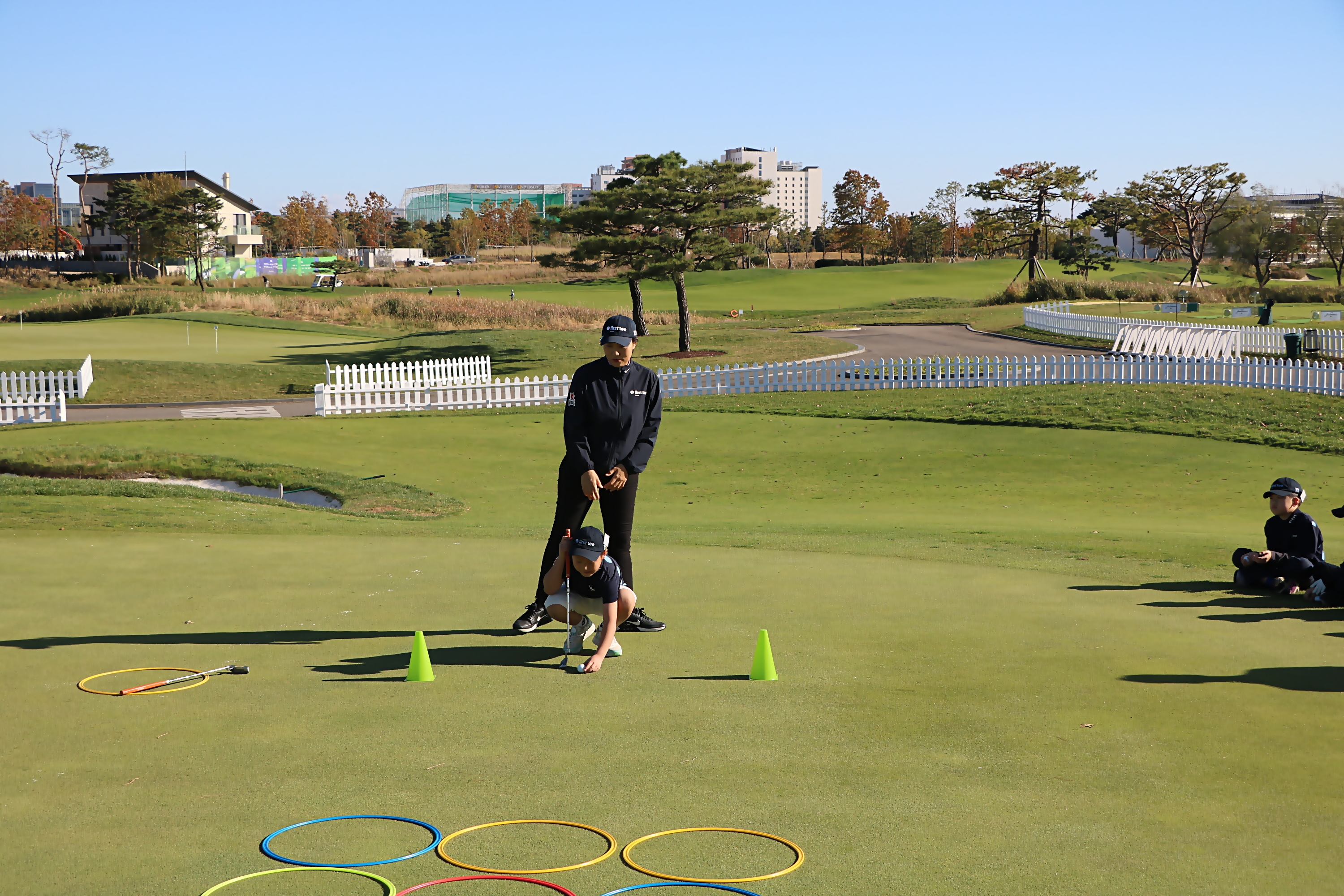 퍼팅 팀대항전에서 자기 소개 후 신중하게 볼을 세팅하고 있는 교육생 모습
