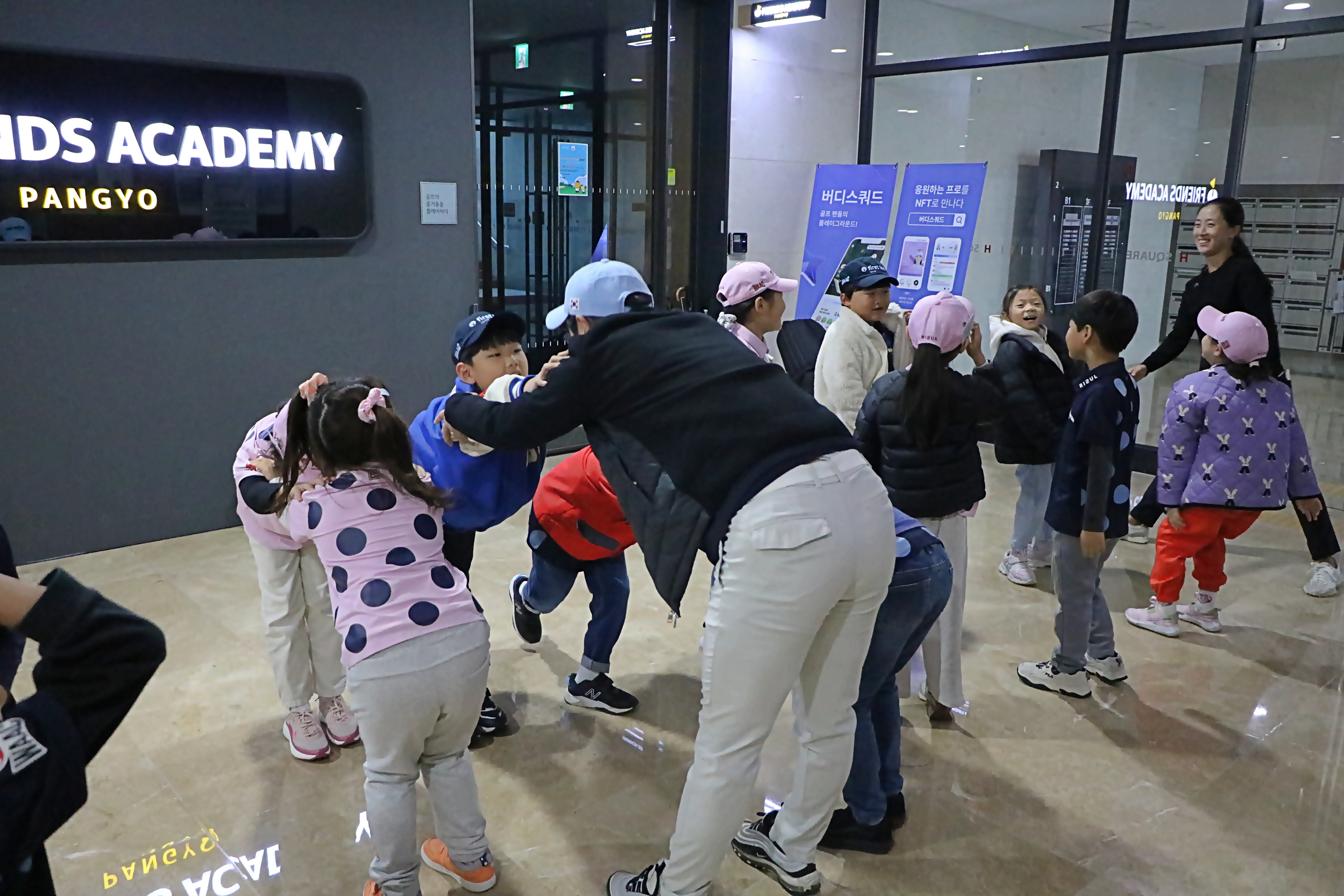 연습장 타석에 들어가기 전 간단하게 밖에서 스트레칭을 하며 몸을 풀고 있는 아이들