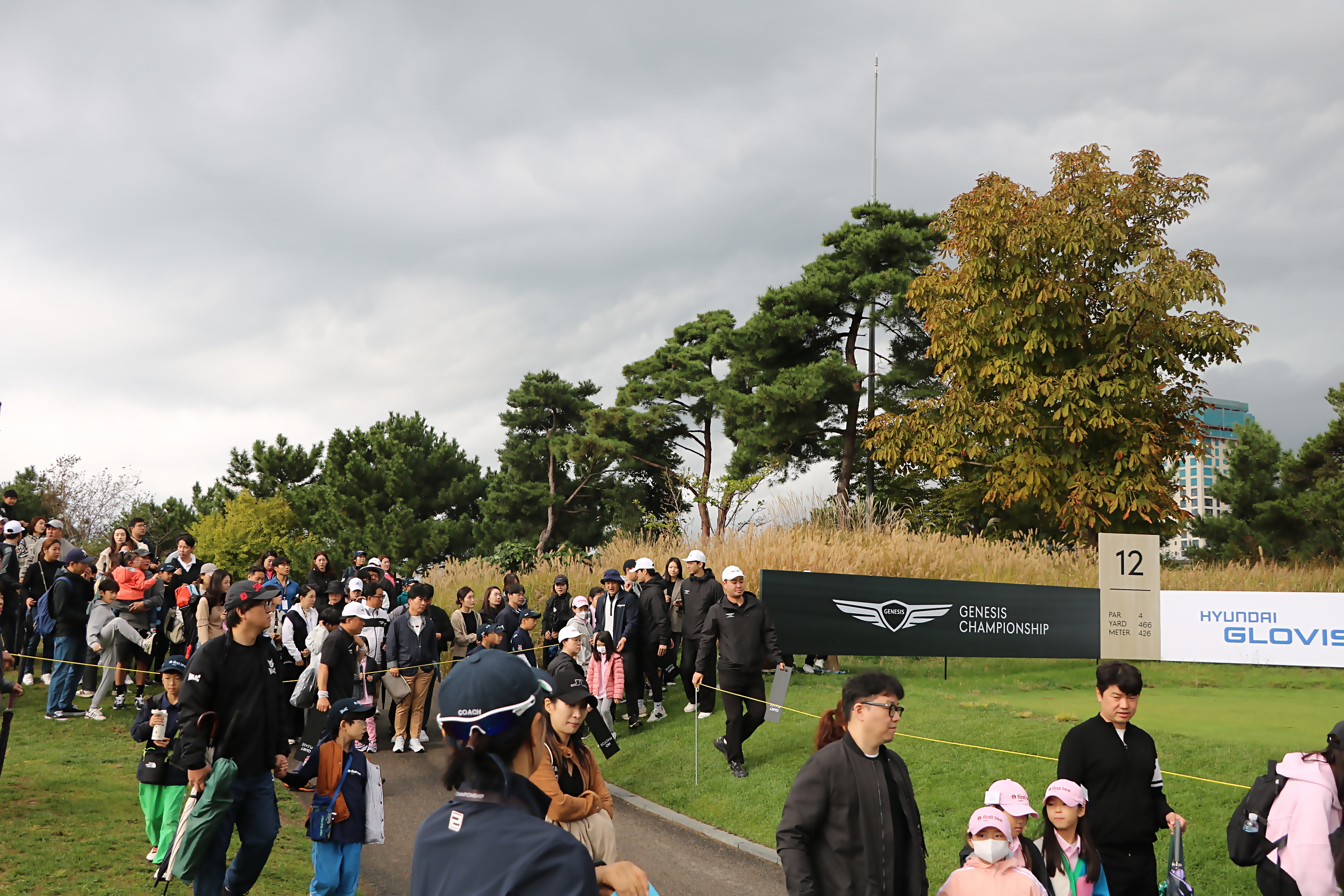 선수들의 티샷 관전을 위해 티잉그라운드에 집결한 교육생들