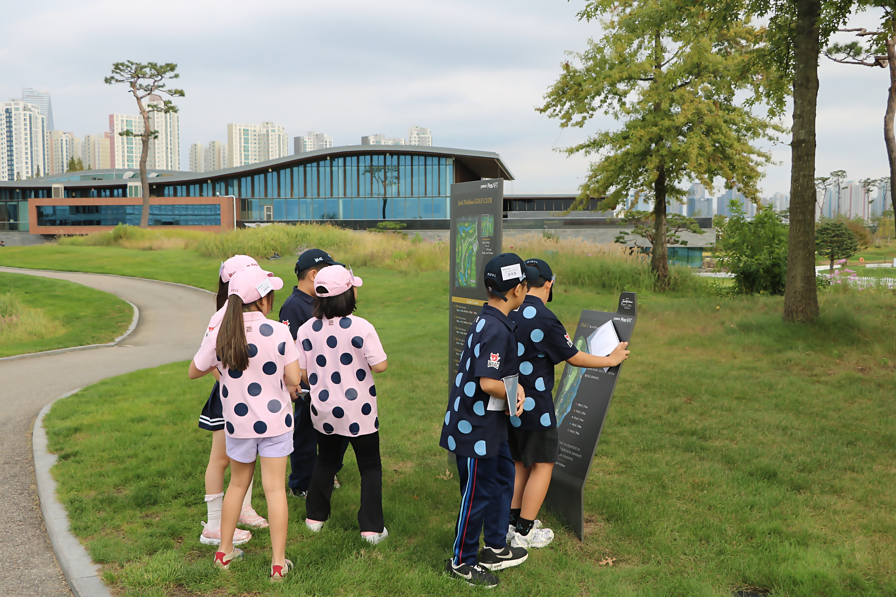 골프장의 티잉그라운드에 실제 설치된 해당 홀의 모양을 설명한 장치물을 보며 그동안 배운 내용을 복습하는 아이들
