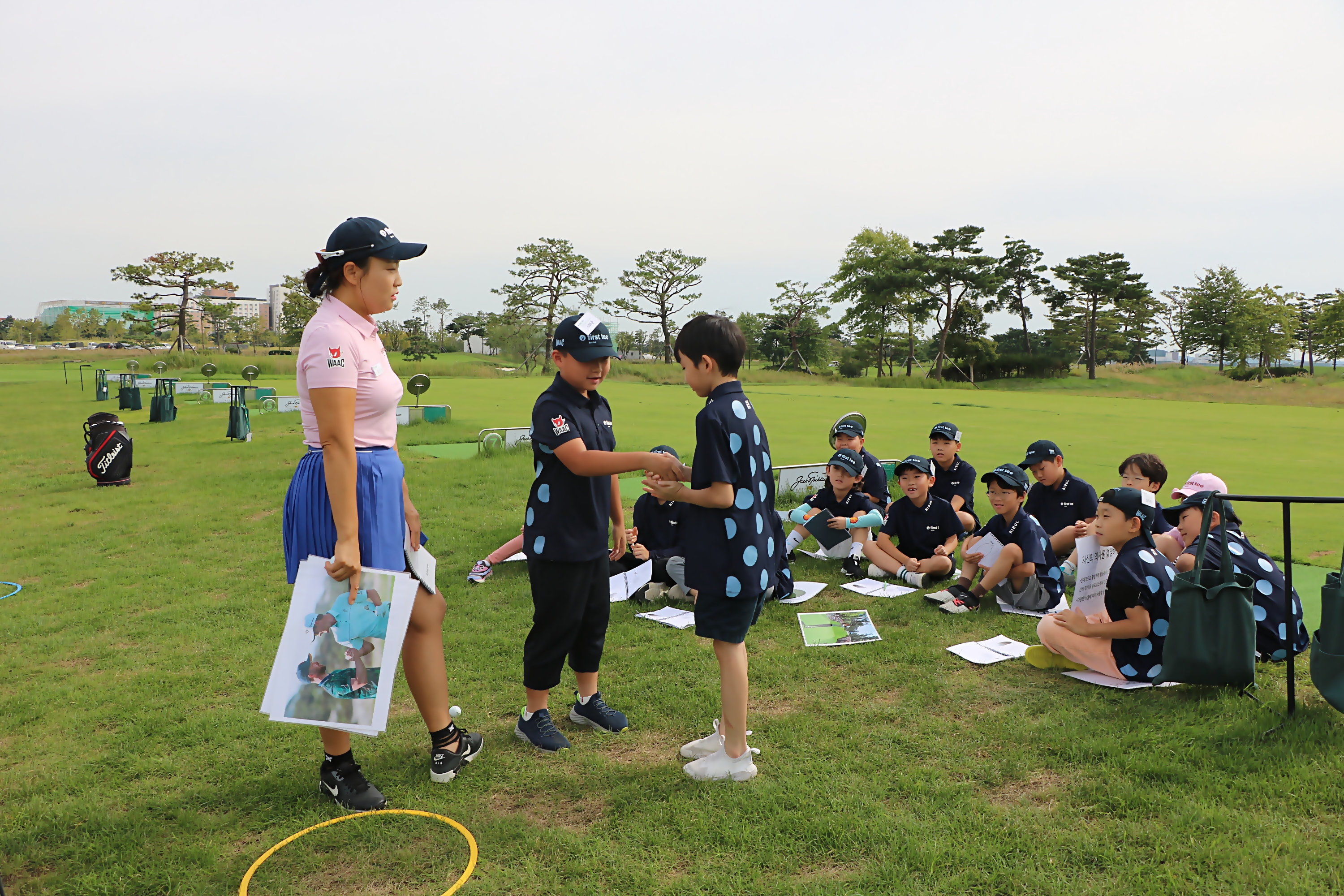 골프 플레이할 때 스포츠맨십을 실천하는 것을 직접 실습해 보고 있는 아이들