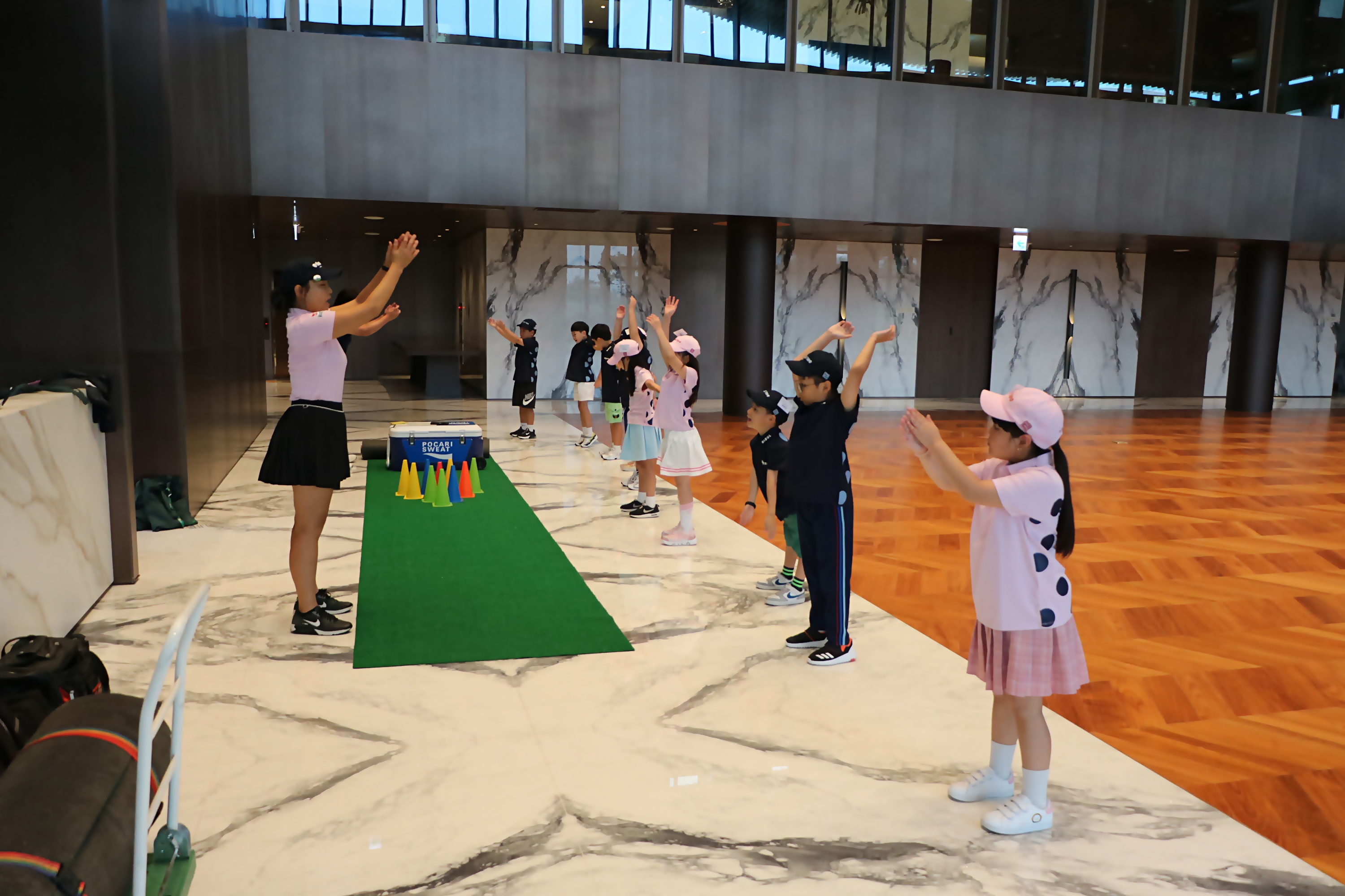 코치님의 구령에 맞춰 양팔돌리기 등을 하며 몸을 풀고 있는 아이들