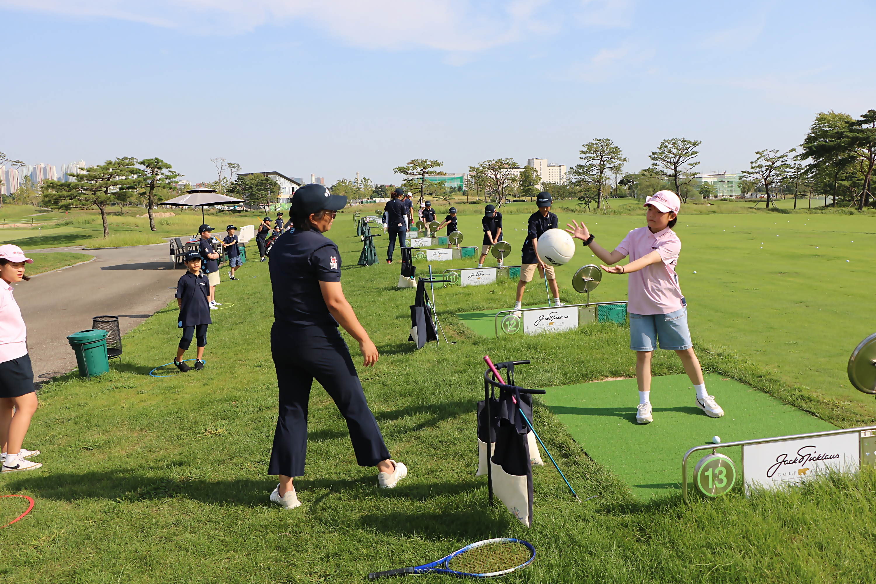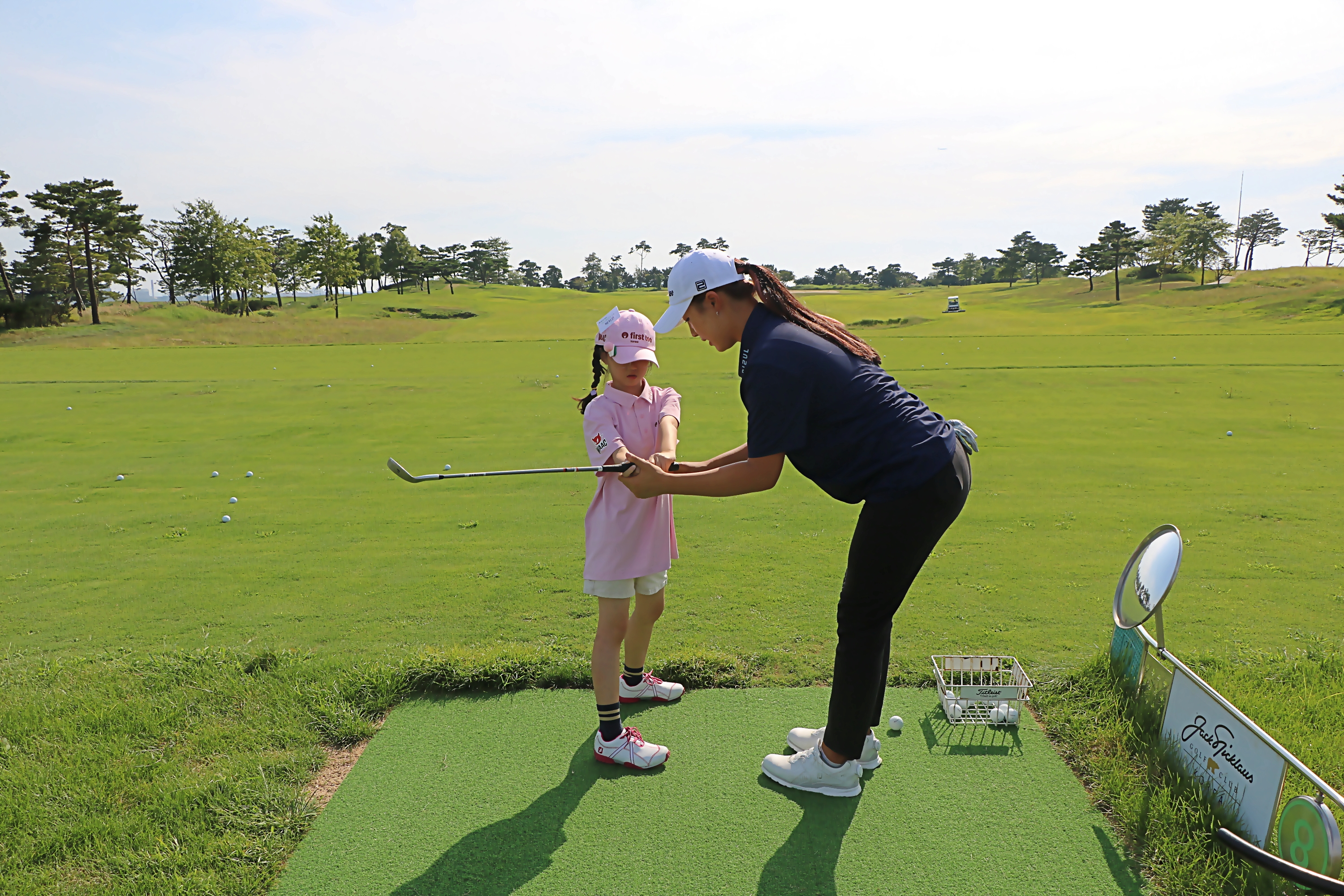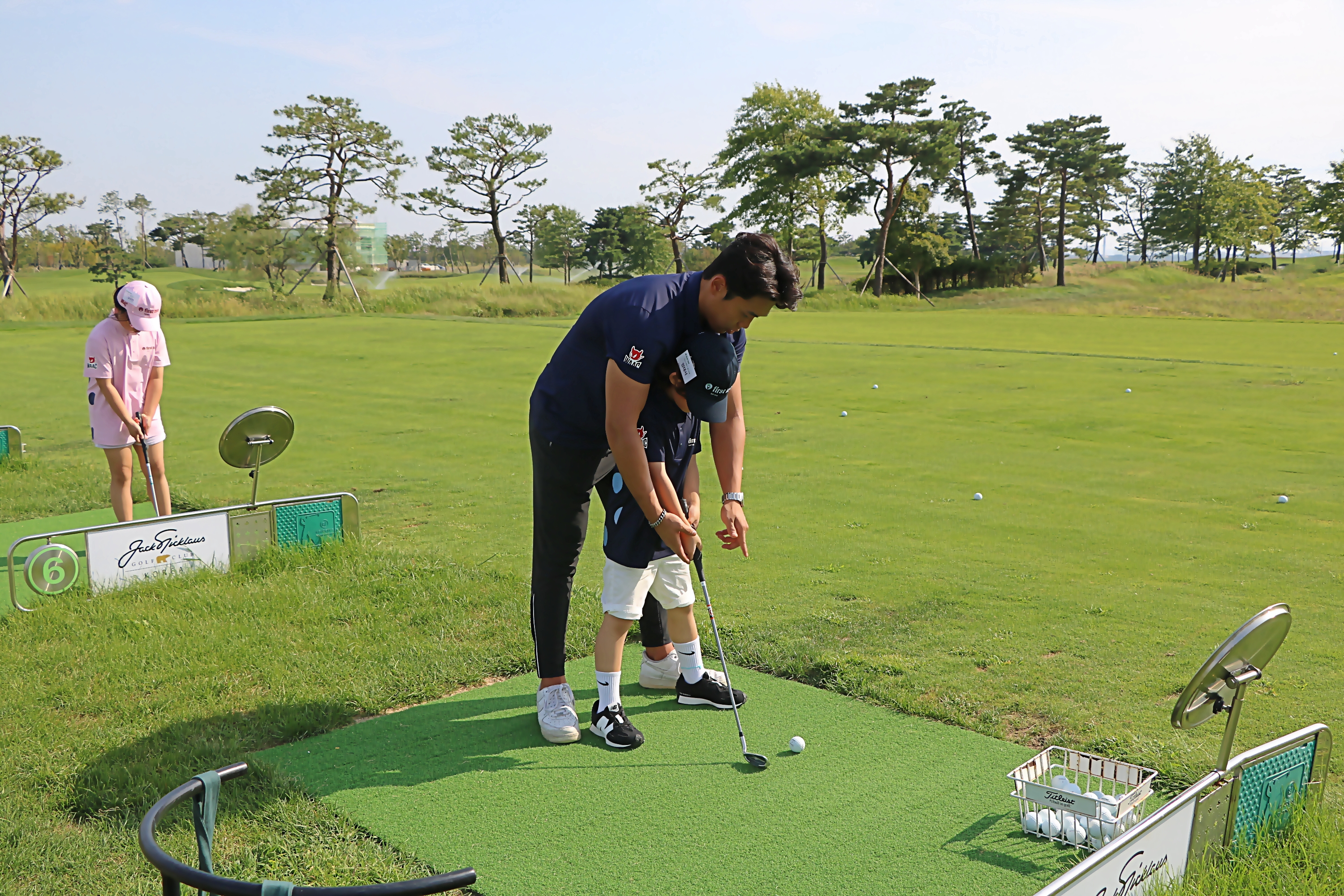 아이들이 이해하기 쉽게 1:1로 골프레슨을 해주고 있는 모습