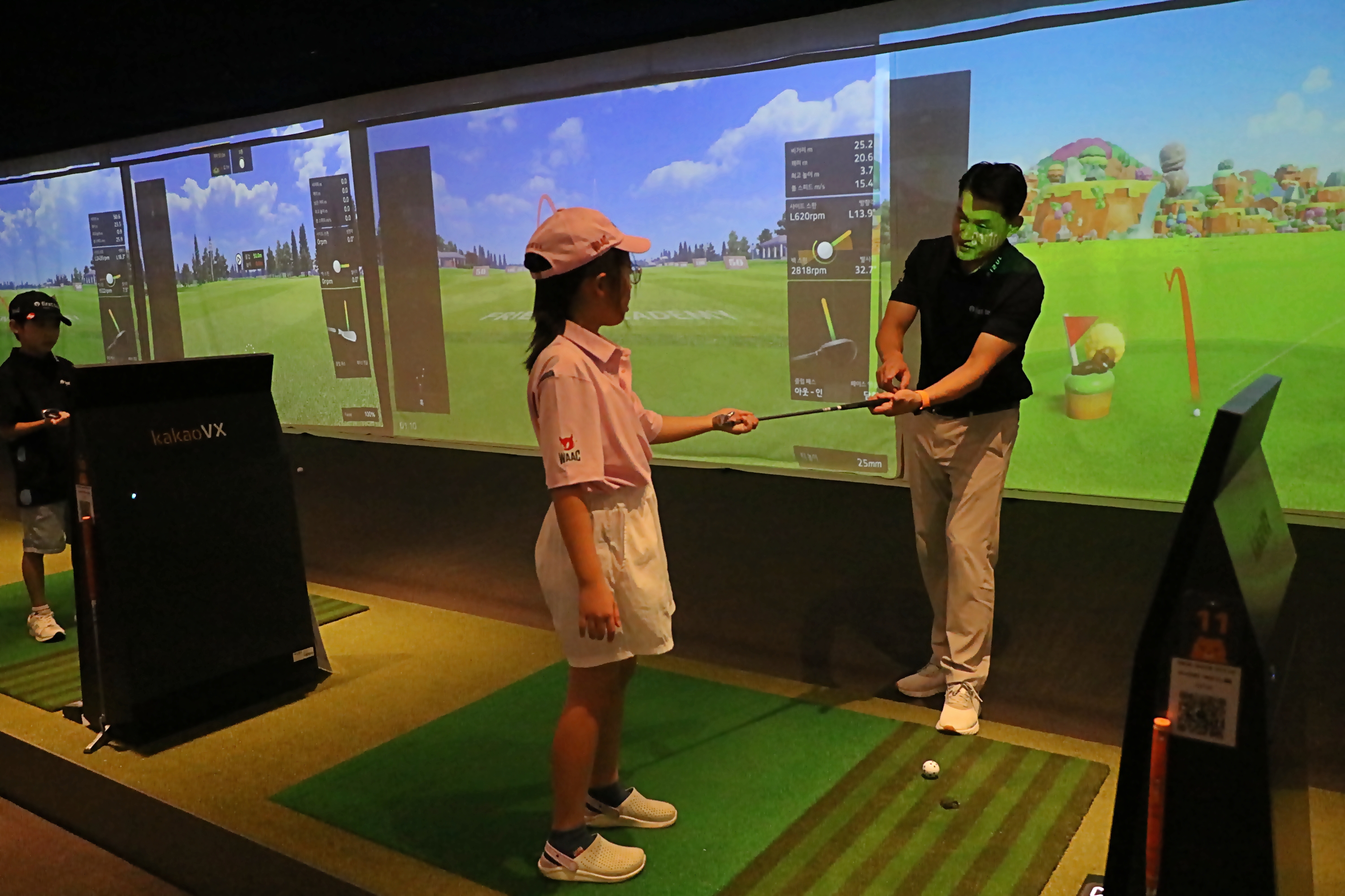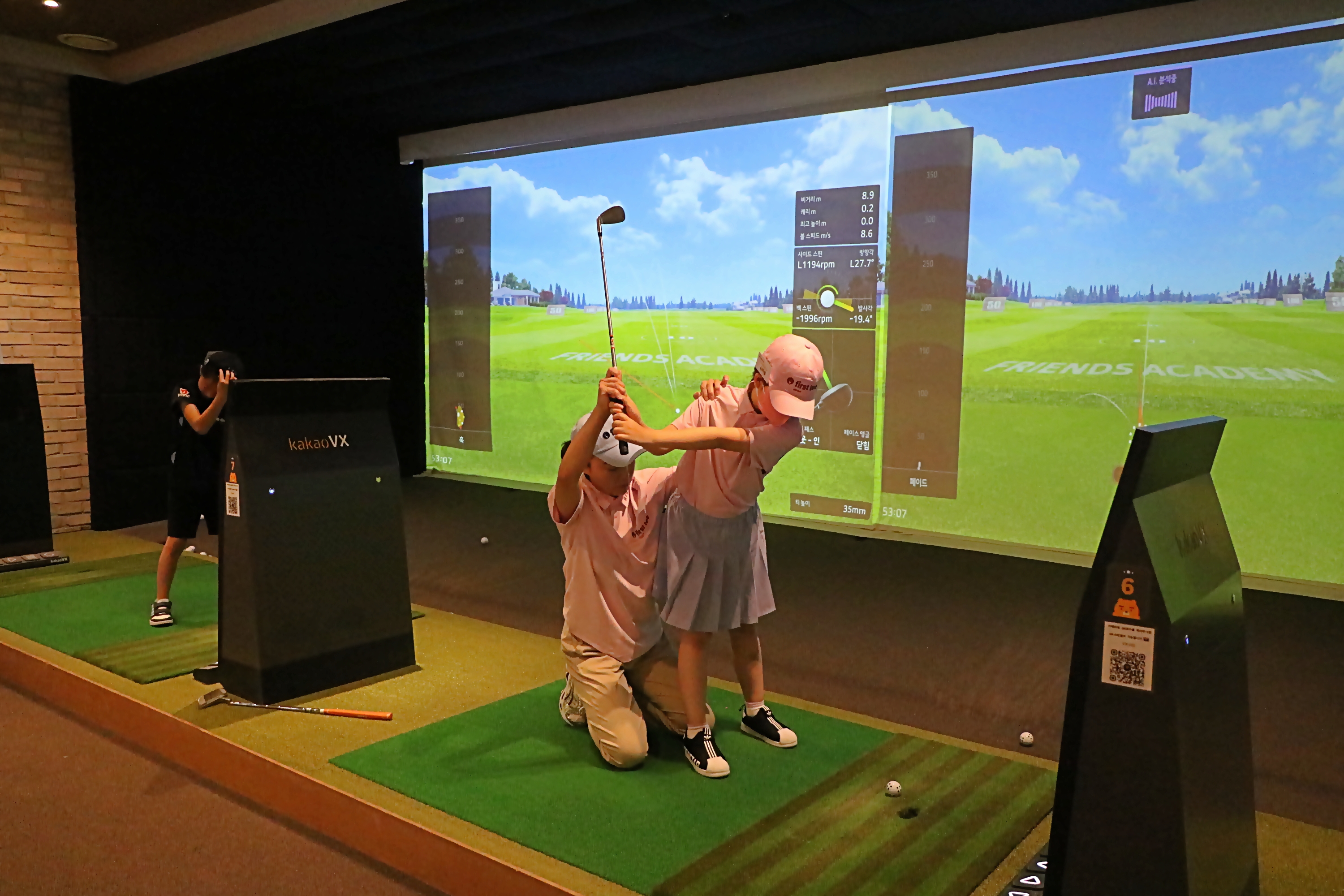 5명의 코치들이 아이들의 골프실력 배양을 위해 맨투맨 밀착 레슨을 펼치고 있다.