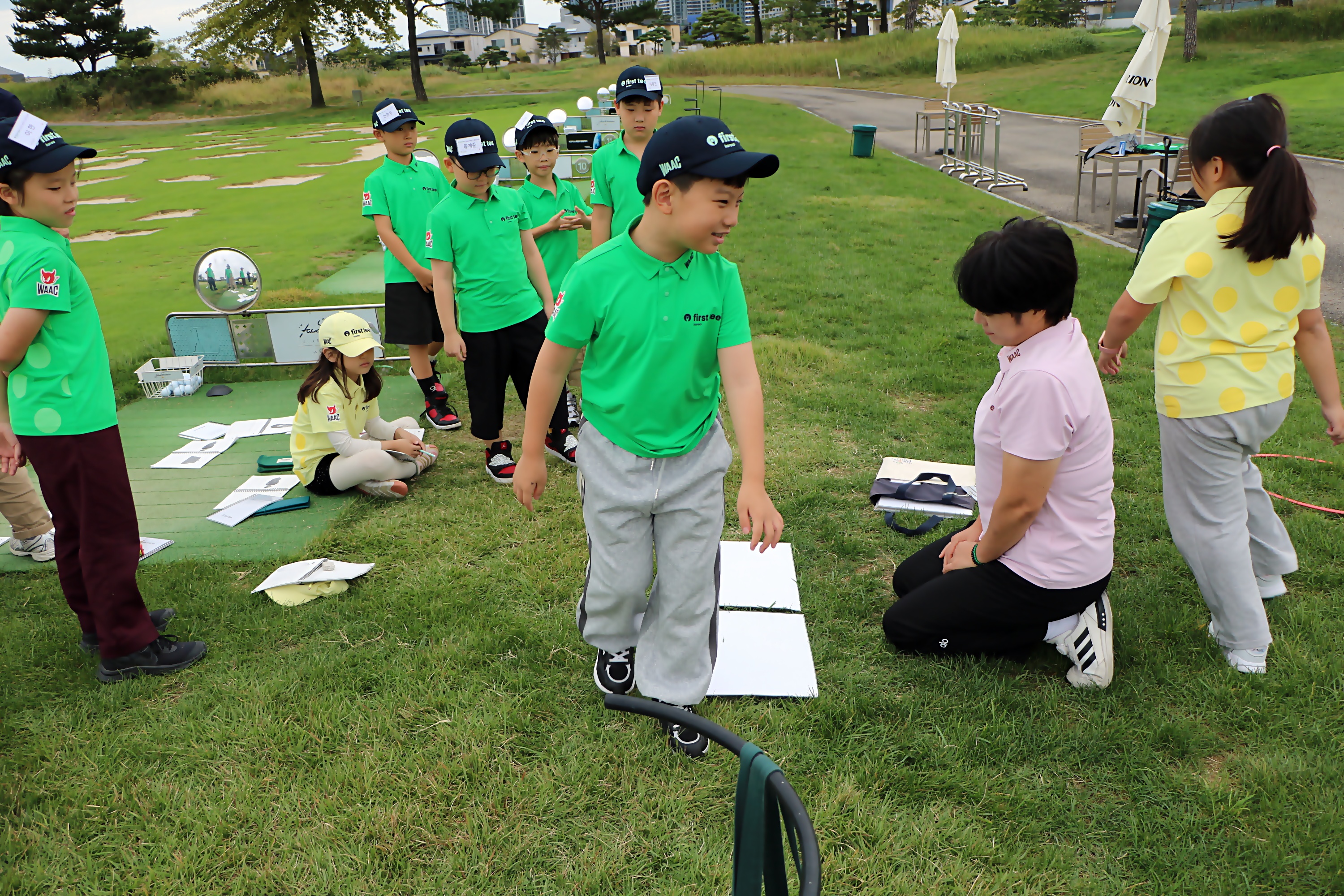 골프라운드할 때 거리 재는 법을 배우고 있는 아이들 모습