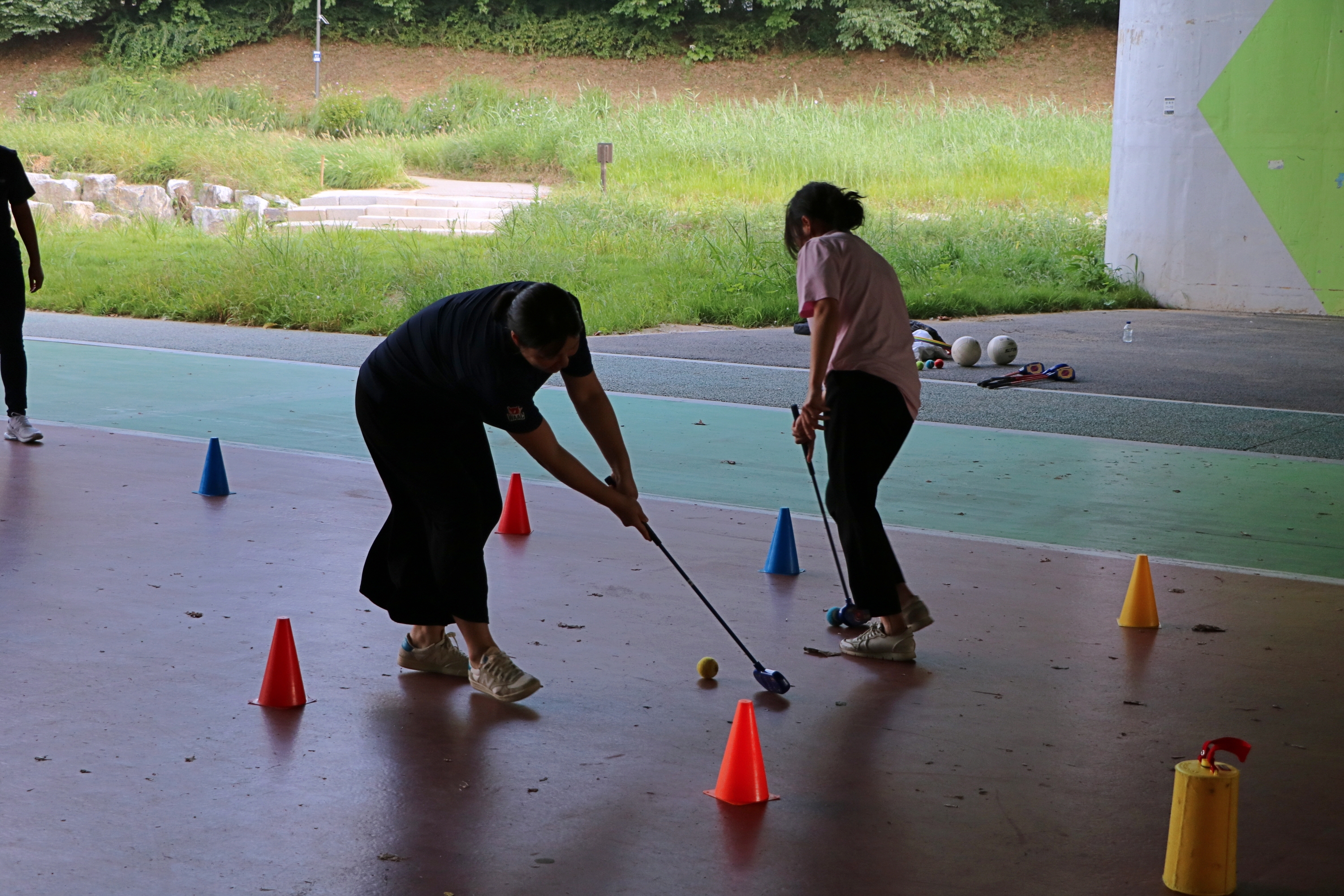 처음 골프를 접하는 교육생들이 퍼터와 친숙해질 수 있게 하는 게임을 실습하고 있는 모습