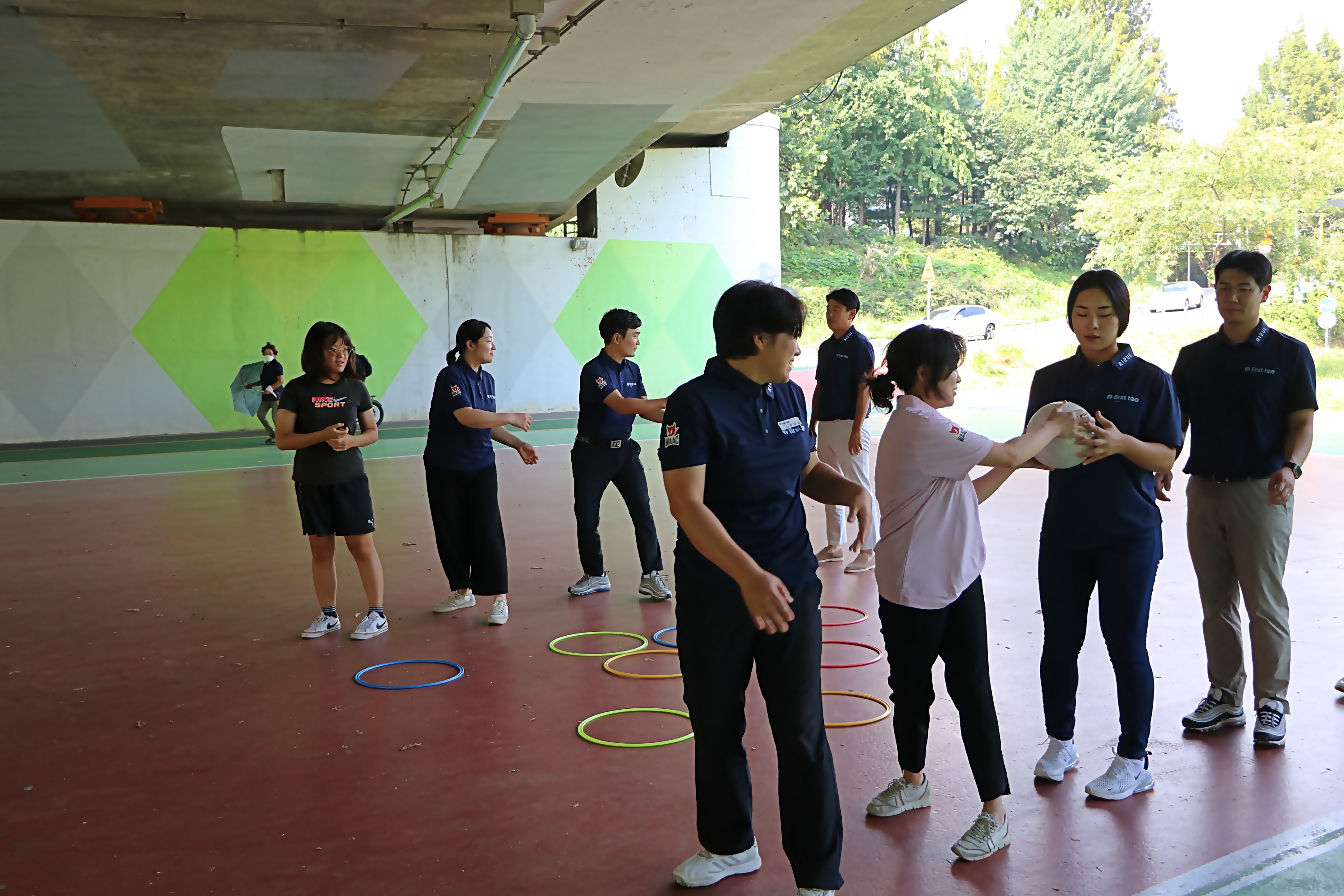 스윙 개념을 익힐 수 있게 해주는 공전달 게임을 실습해보고 있는 모습