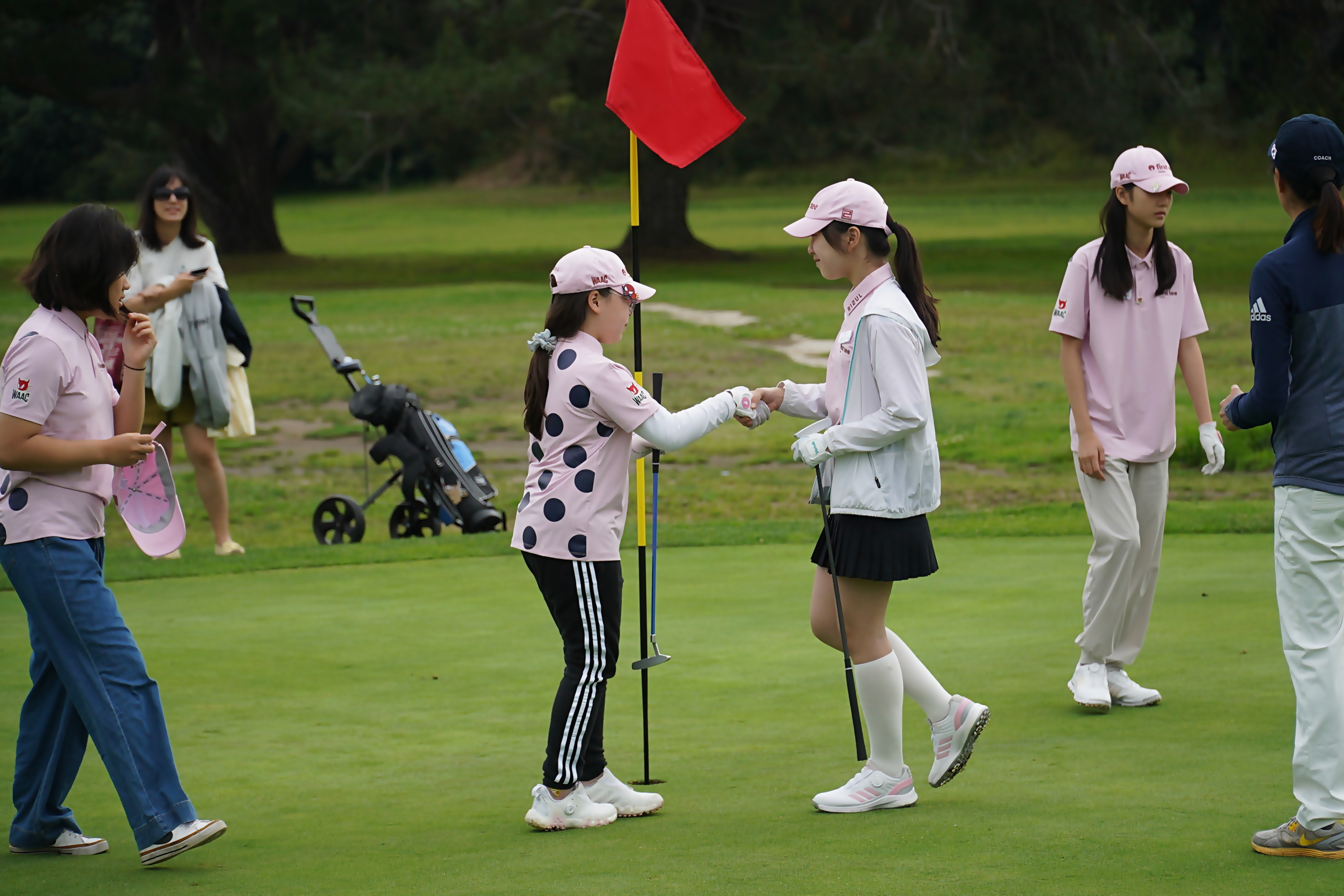 마지막 홀을 홀아웃하며 동반자들과 악수를 하며 스포츠맨십을 실천하고 있는 모습